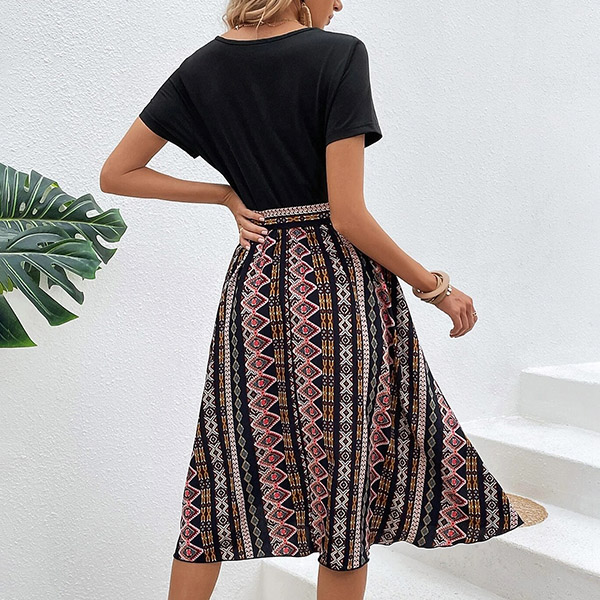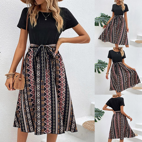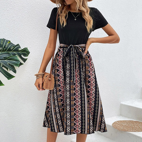 Fashion Contrast Color Floral Printed Round Neck Short Sleeve Self-tie Mini Dress