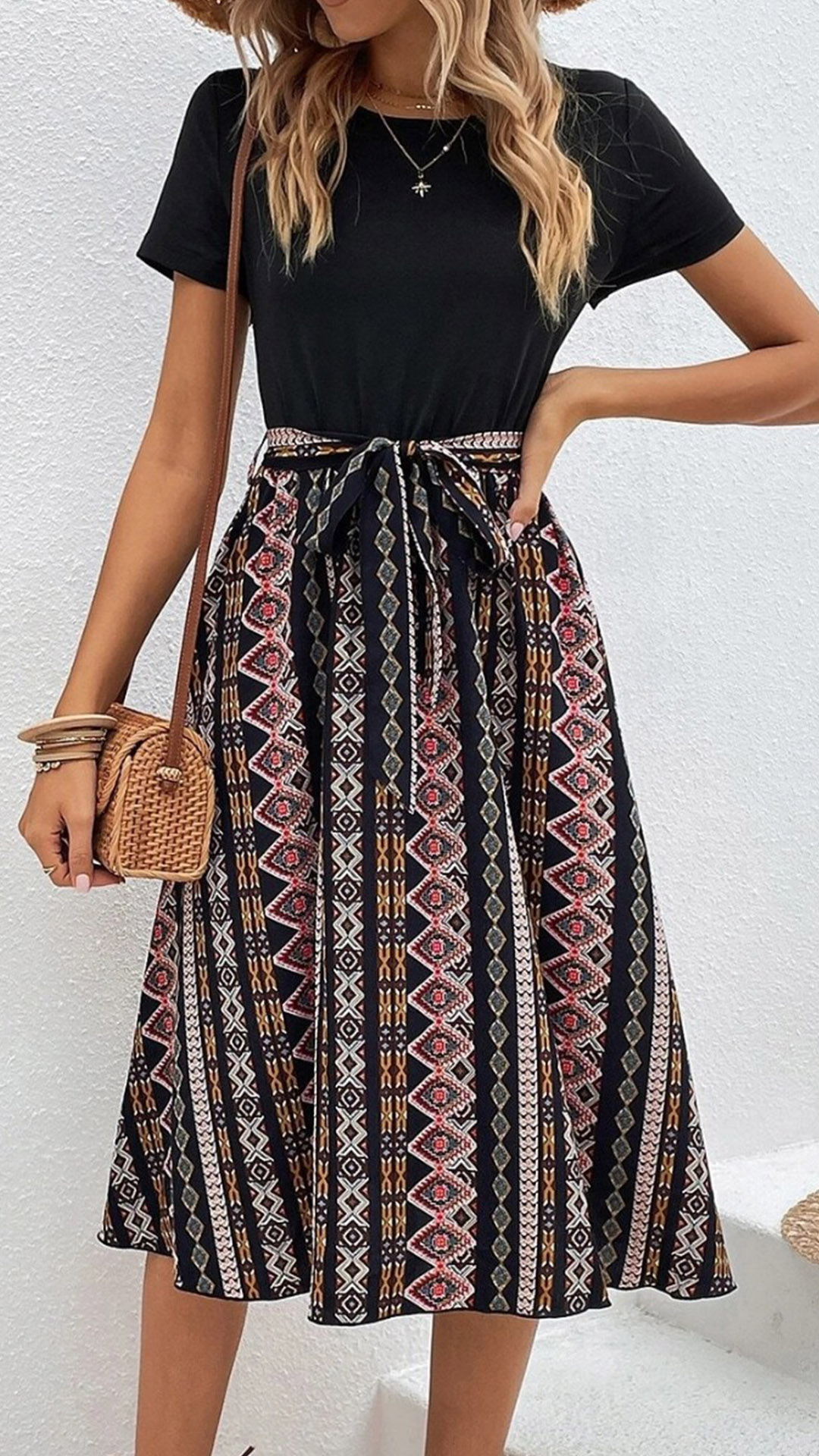 This is a stylish and feminine piece that combines a contrast color design, floral print, round neck, short sleeves, and self-tie detail for a fashionable and trendy look.
