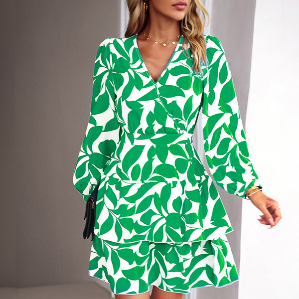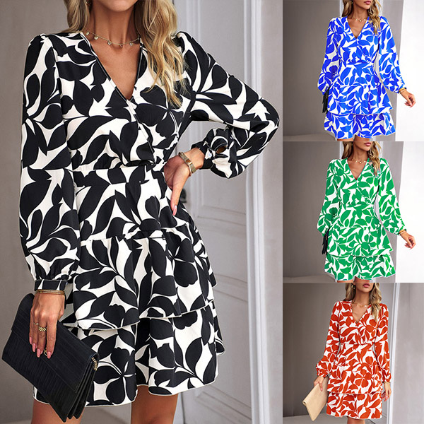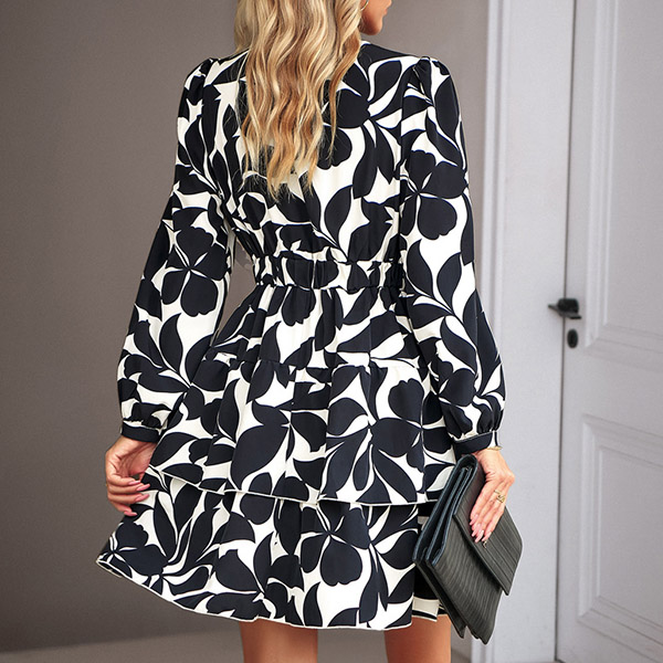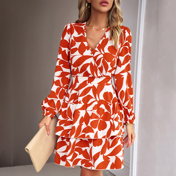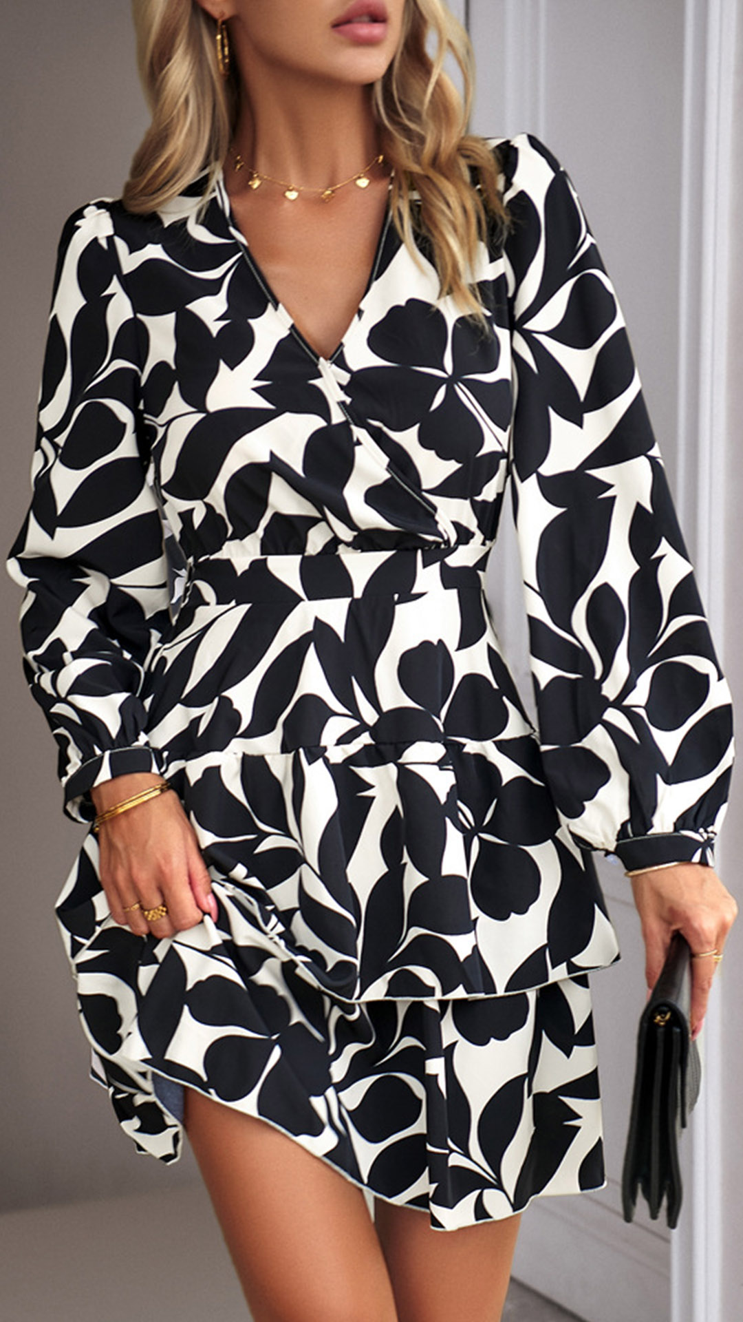 Fashion Contrast Color Floral Printed V-neck Long Sleeve Mini Dress