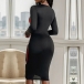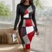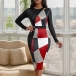 Fashion Contrast Color Geometric Pattern Crew Neck Long Sleeve Bodycon Dress
