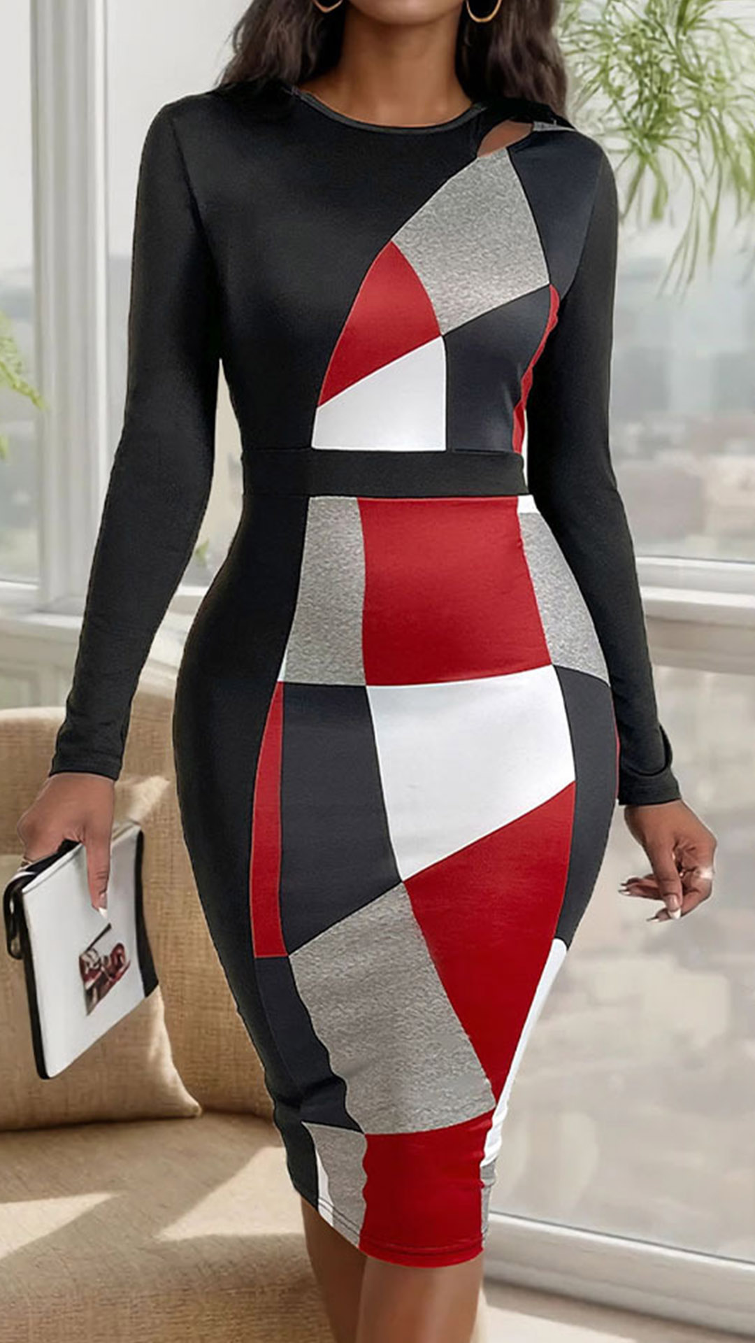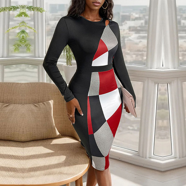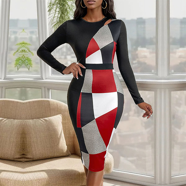 This fashionable bodycon dress features a contrast color geometric pattern, a crew neckline, long sleeves, and a figure-hugging silhouette, creating a bold and stylish look. Wanna have one?