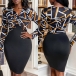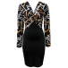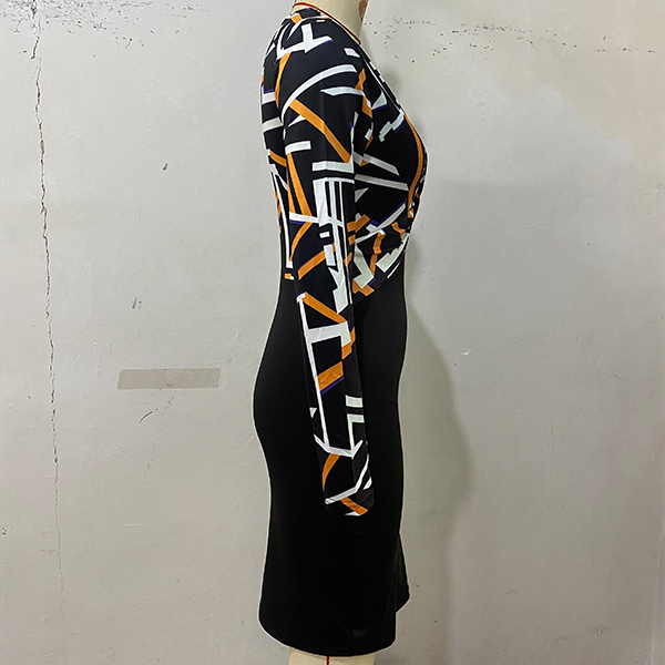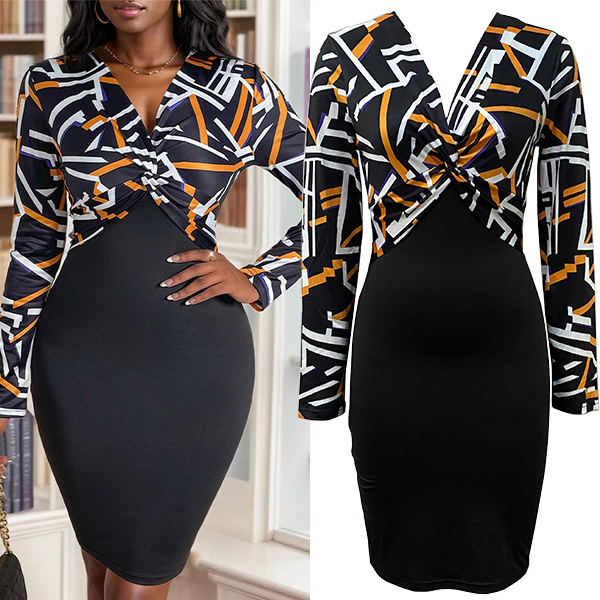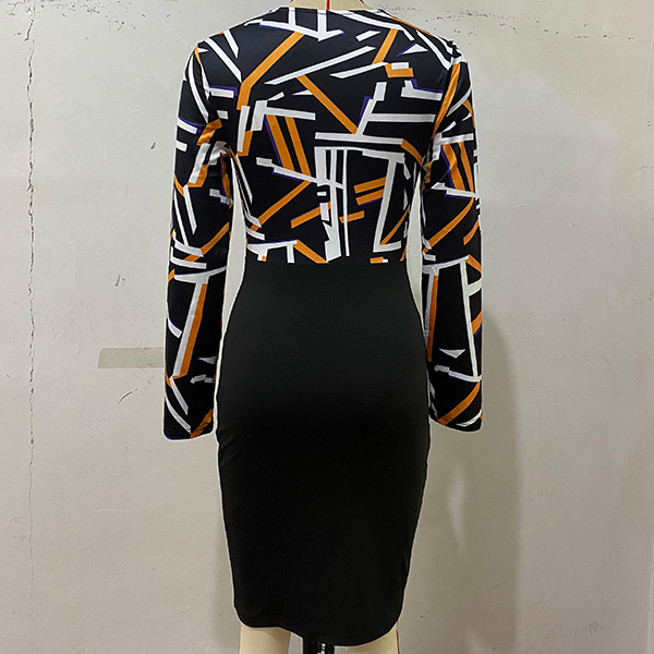 Fashion Contrast Color Geometric Printed Ruched V-neck Long Sleeve Bodycon Dress