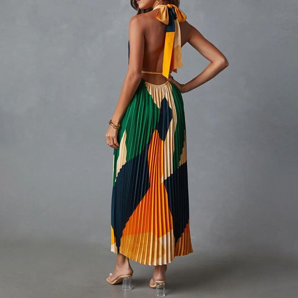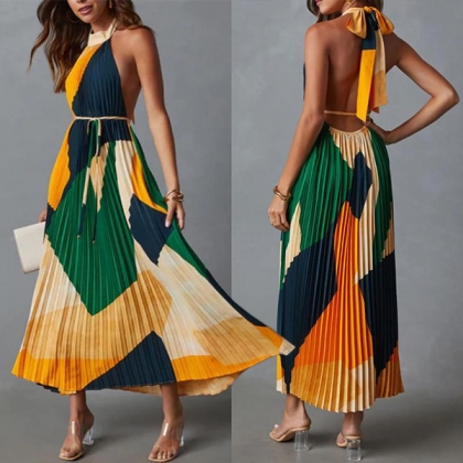 Fashion Contrast Color Halterneck Backless Pleated Dress