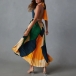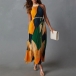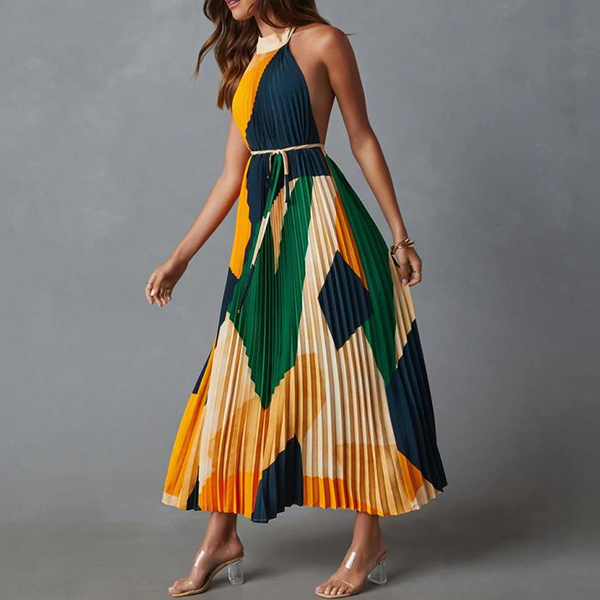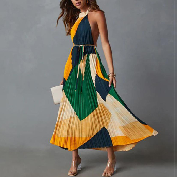 This striking pleated dress features a bold contrast color printed design that immediately commands attention. The halterneck silhouette, backless details with its sleek and streamlined construction, creates a modern and alluring look that flatters the figure.