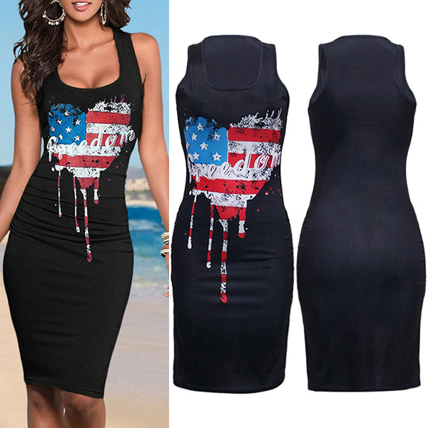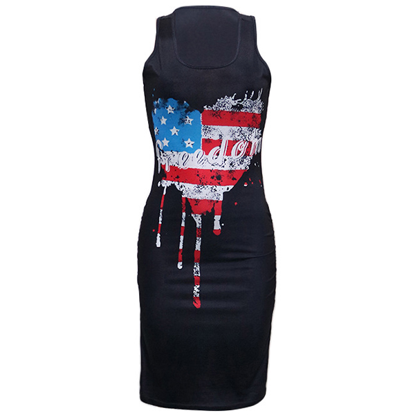 Fashion Contrast Color Heart Flag Printed Round Neck Sleeveless Bodycon Tank Dress