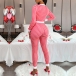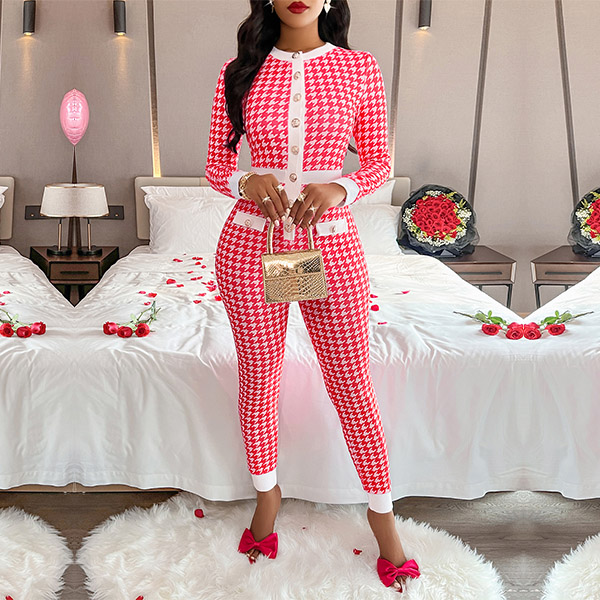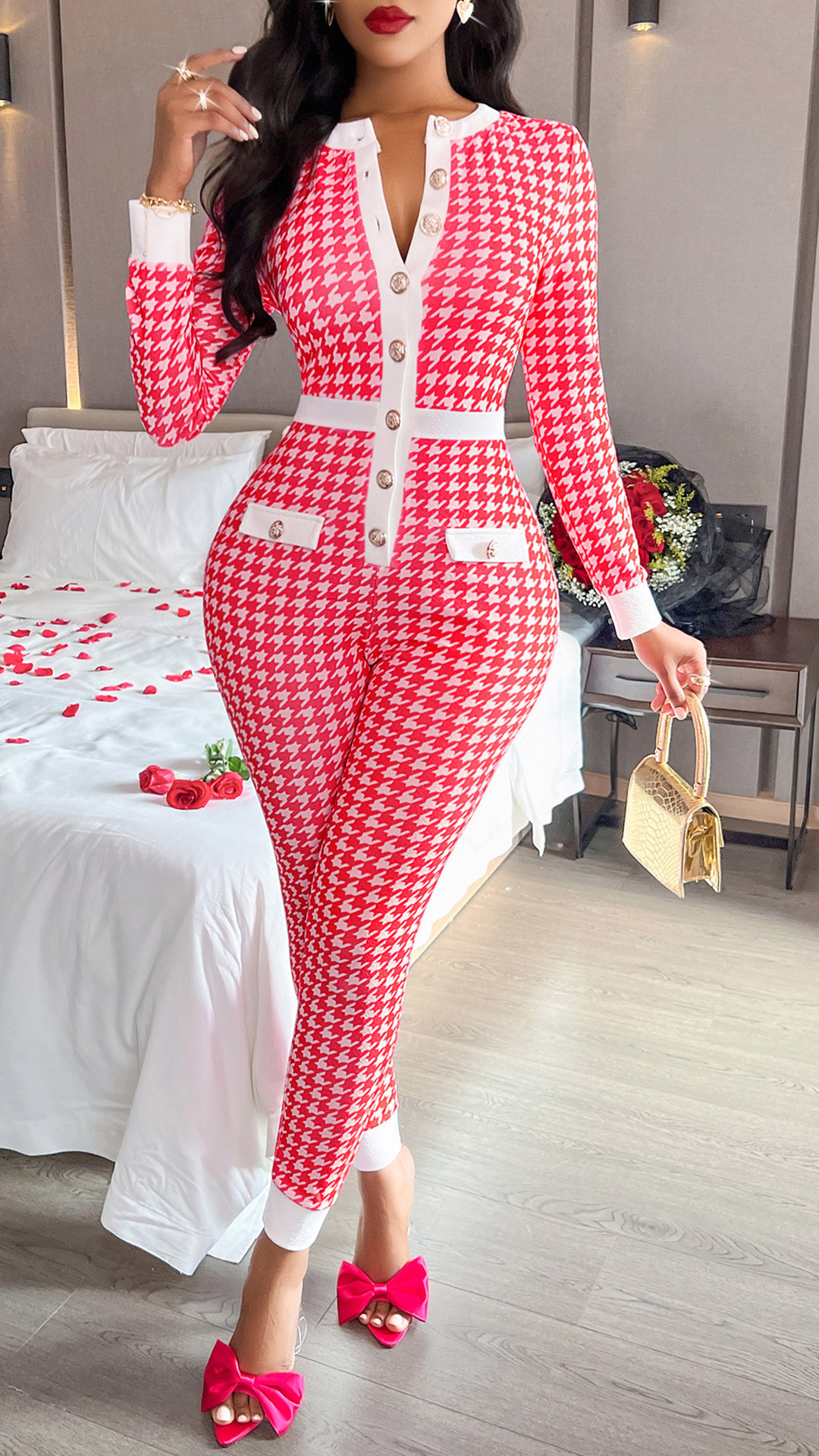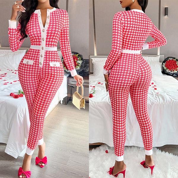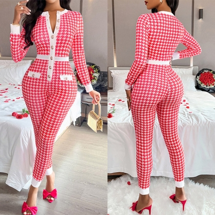 Fashion Contrast Color Houndstooth Printed Button V-neck Long Sleeve Skinny Jumpsuit