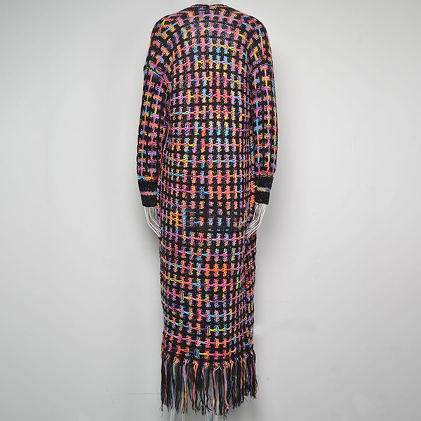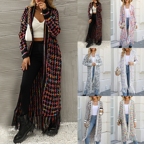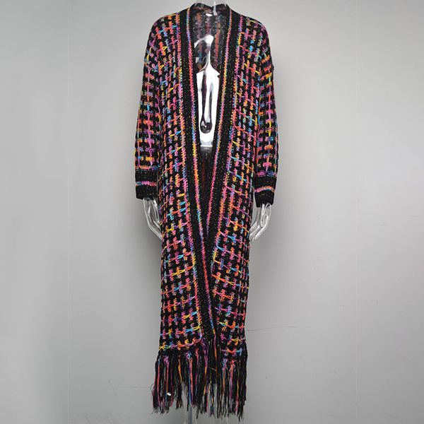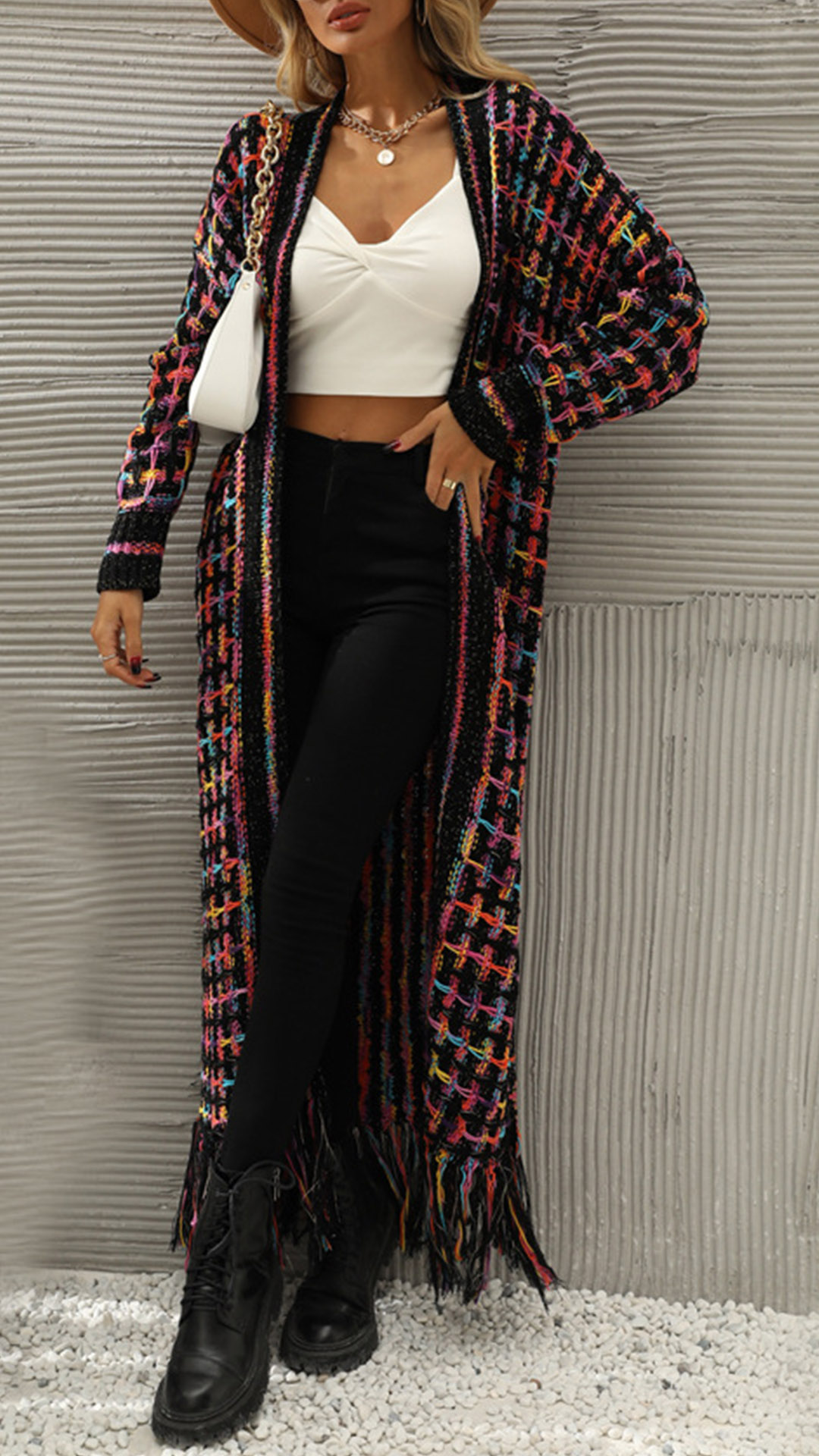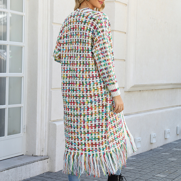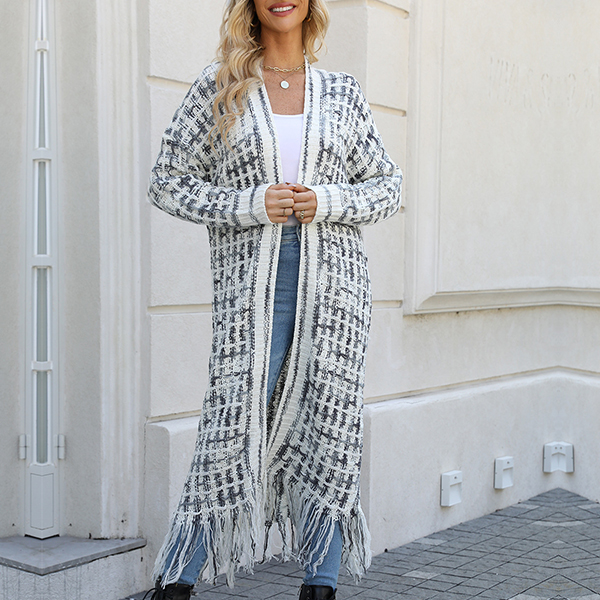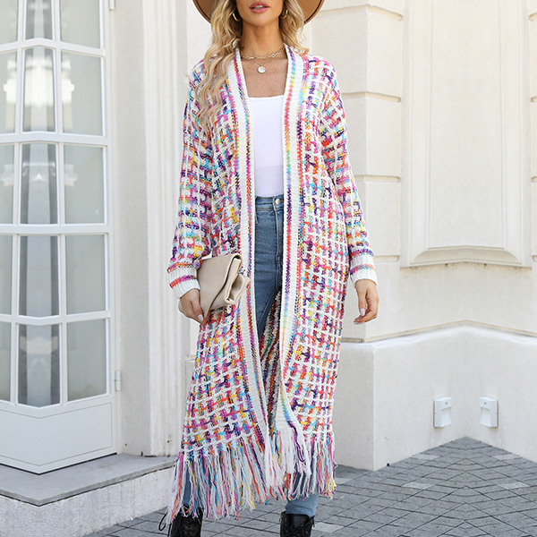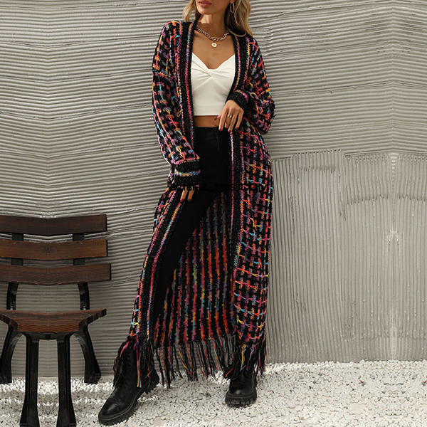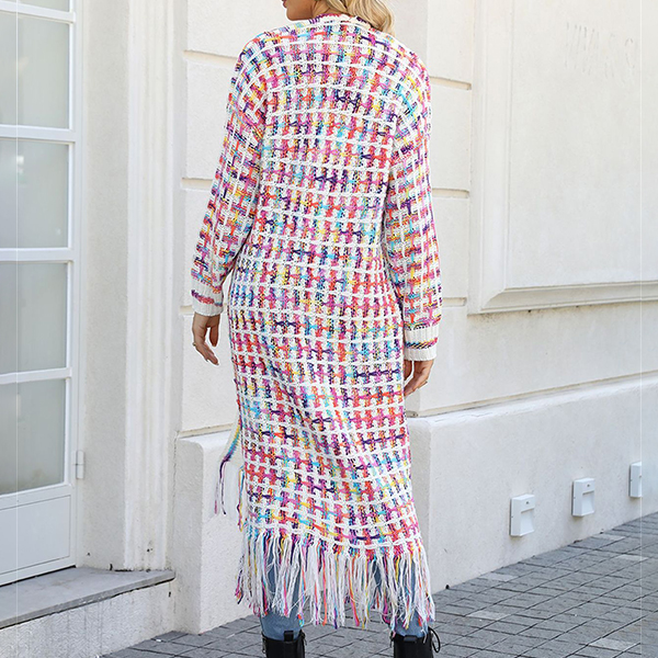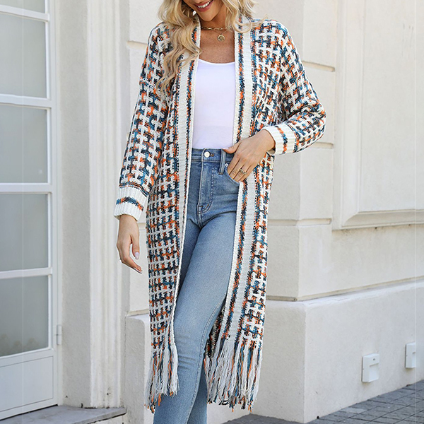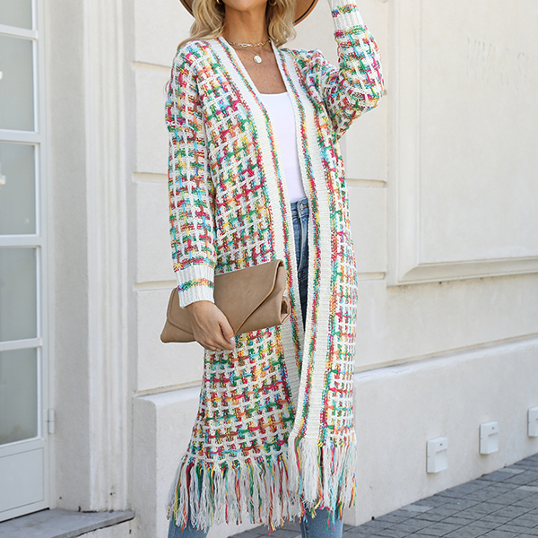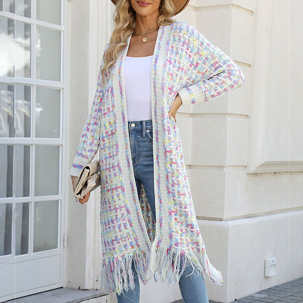 Fashion Contrast-color Knitted Long Sleeve Tassel Hemline Cardigan
