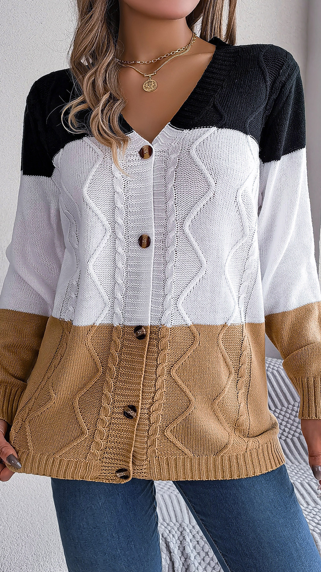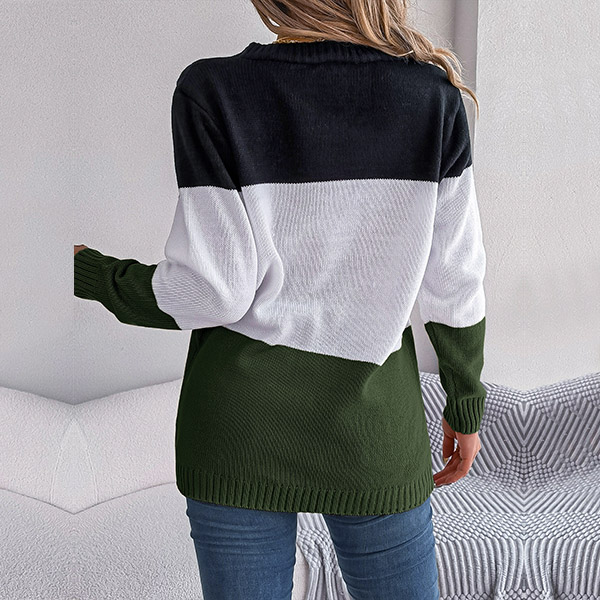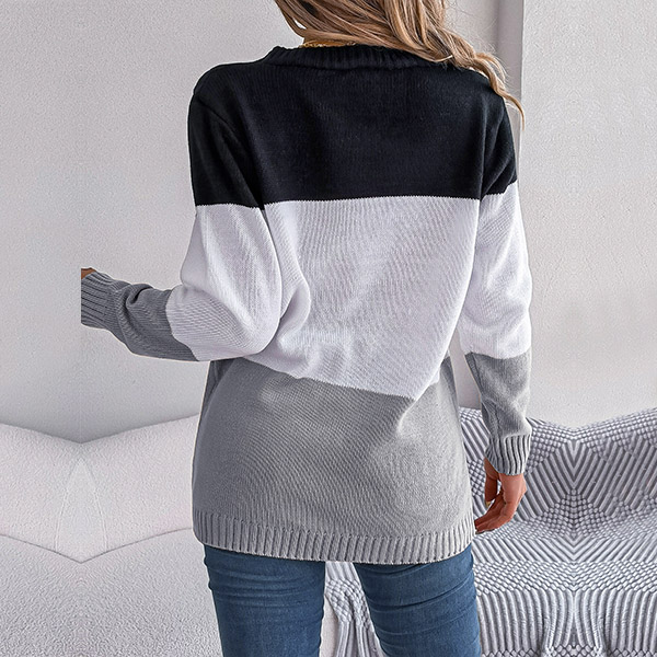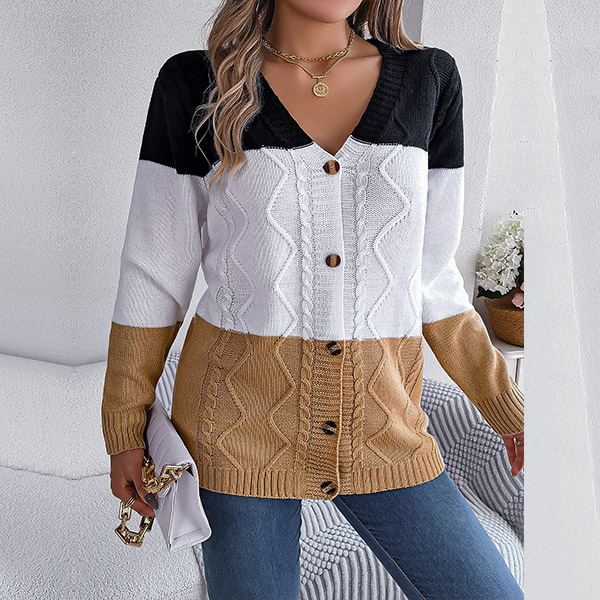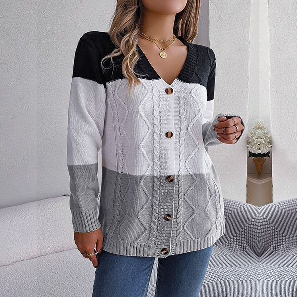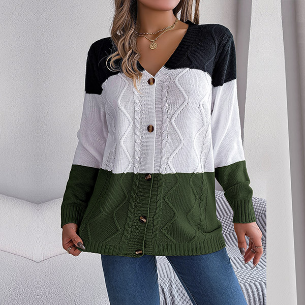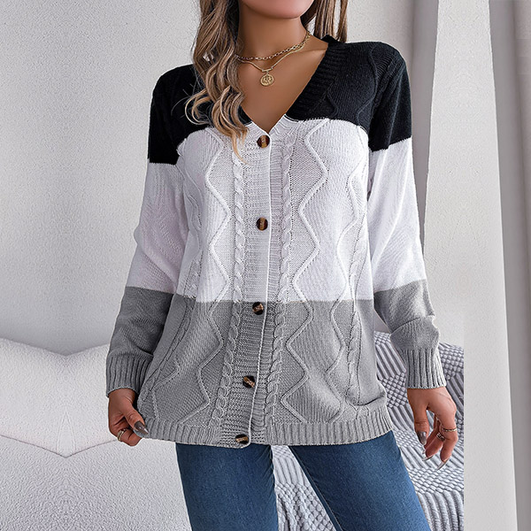 Fashion Contrast Color Knitted V-neck Long Sleeve Cardigan