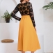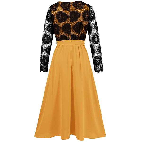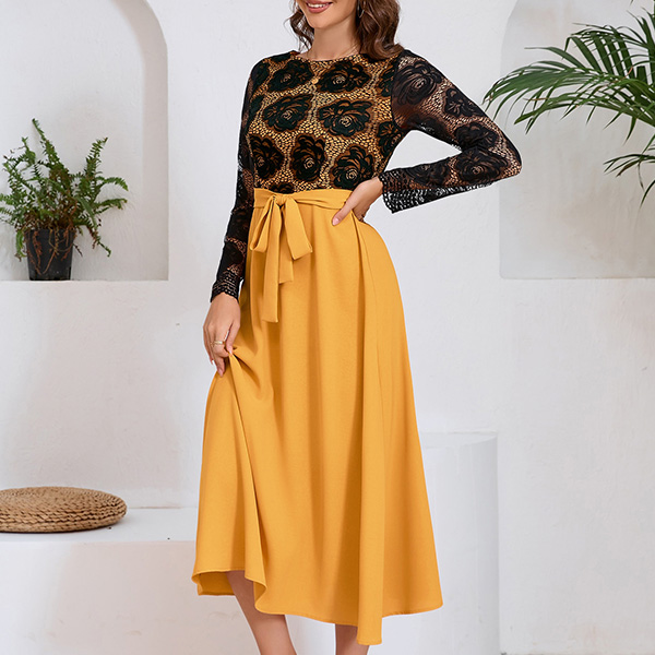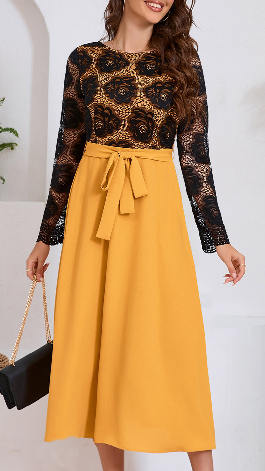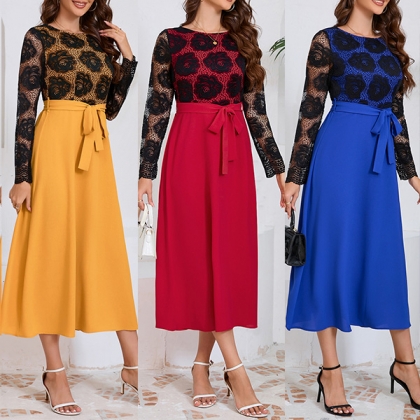 This midi dress features a contrast color design with lace splicing on the bodice, a crew neck, long sleeves, and a self-tie waist detail, creating a chic and stylish look. The contrast color lace splicing add a unique and eye-catching element to the dress, making it a statement piece in your wardrobe. Color:Yellow,Red,Blue, which one do you like?
