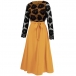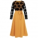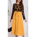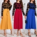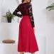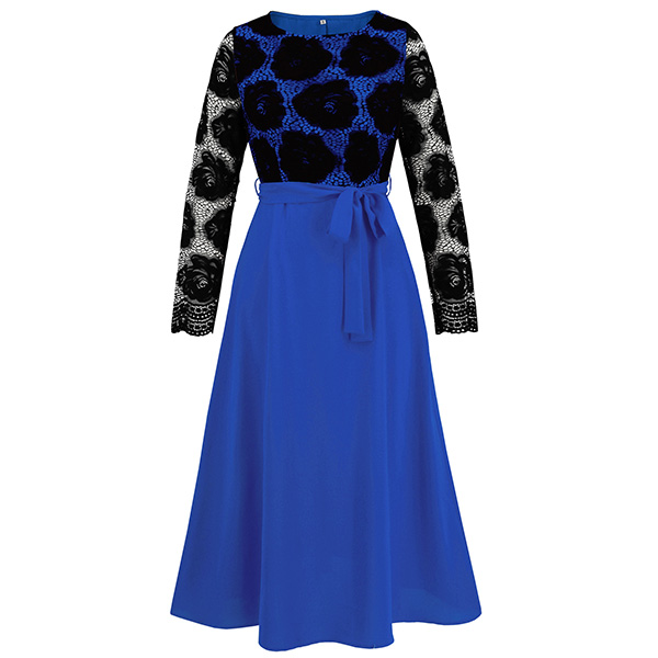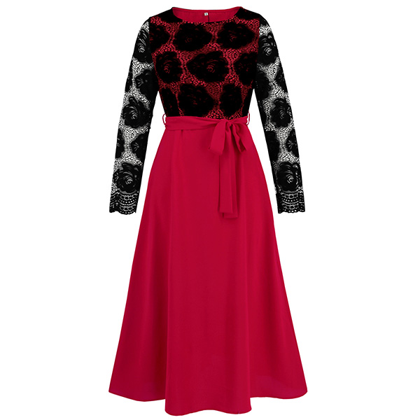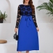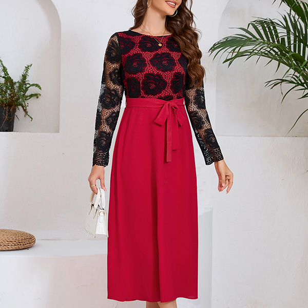 Fashion Contrast Color Lace Spliced Crew Neck Long Sleeve Self-tie Waist Midi Dress