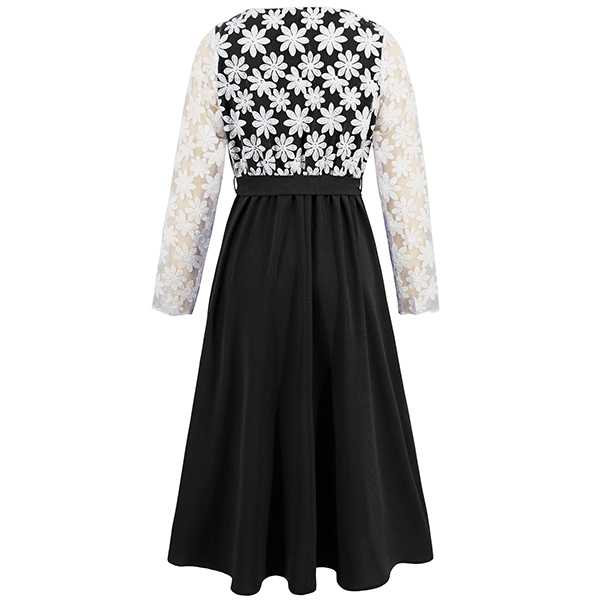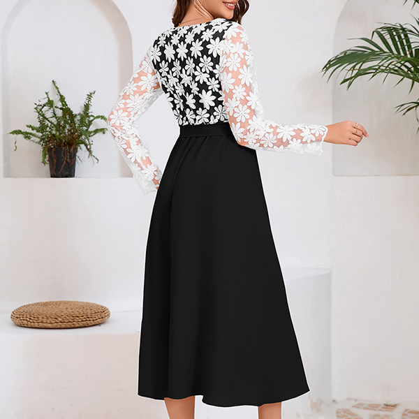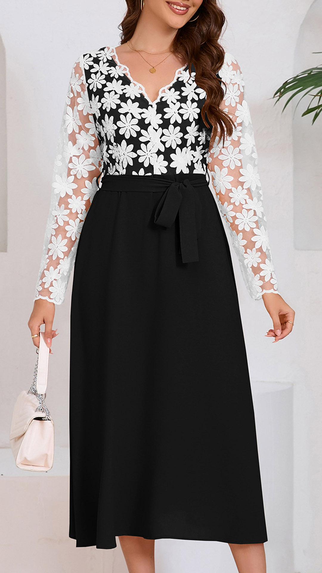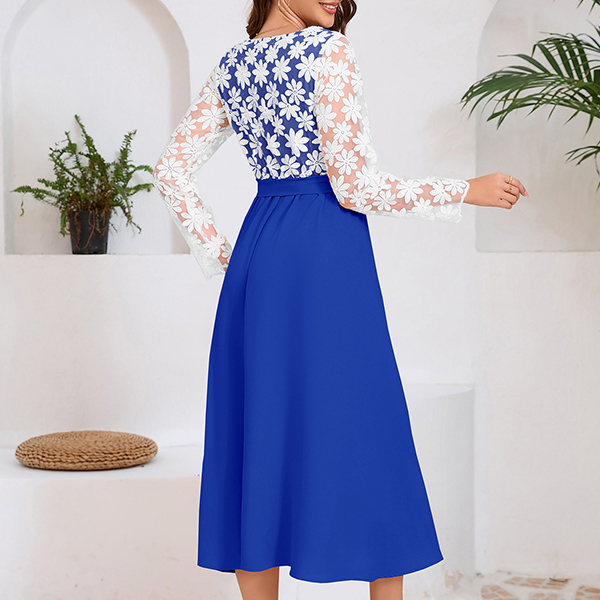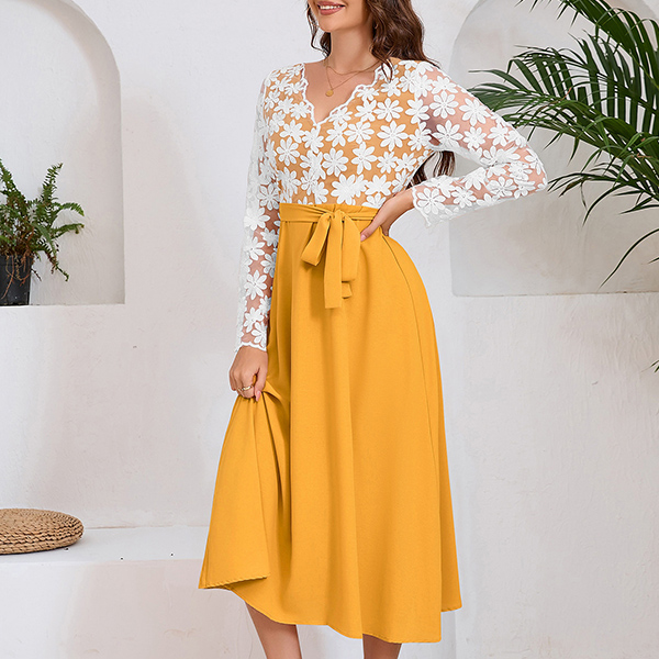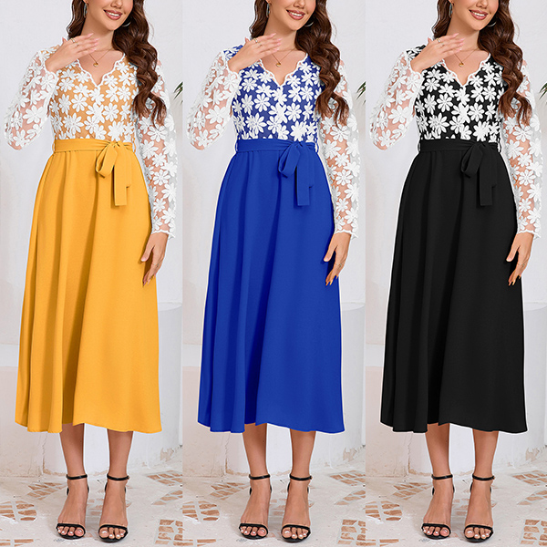 This dress features a contrast color design, lace splicing bodice, a V-neckline, long sleeves, and a self-tie waist detail, creating a trendy and stylish look. This dress is perfect for creating a chic and fashion-forward outfit. Hope you like it.