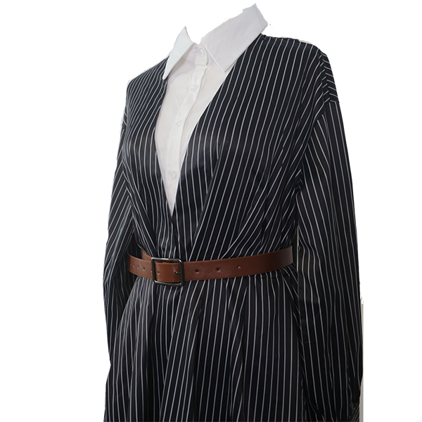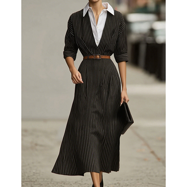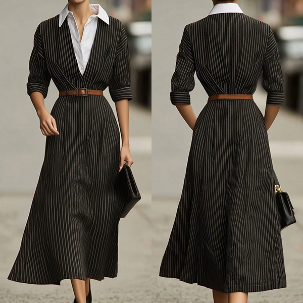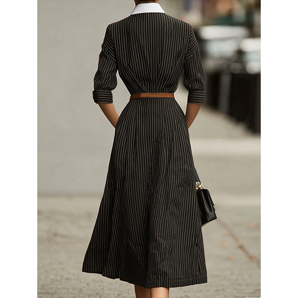 Make a stylish statement with Midi Dress with Belt. This chic dress features a contrast color trendy lapel collar and a flattering V-neckline, enhanced by long sleeves for an elegant touch. The bold vertical stripes add visual interest and lengthen your silhouette. Complete with a sophisticated belt to cinch the waist, this midi dress is perfect for both office wear and outings. Wanna have a try?