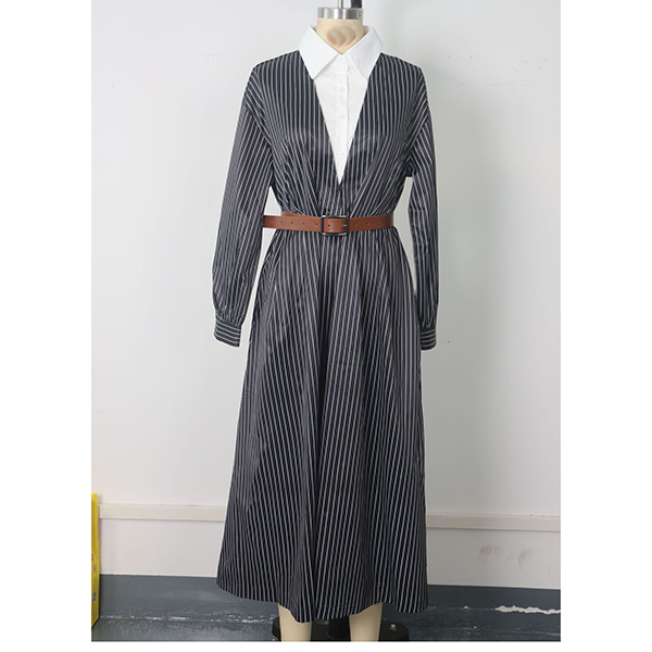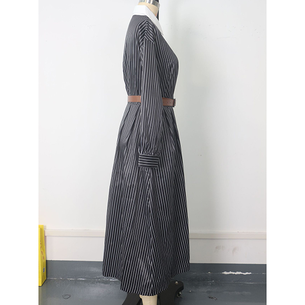 Fashion Contrast Color Lapel Collar V-neck Long Sleeve Verticial Stripe Printed Midi Dress with Belt