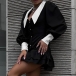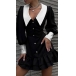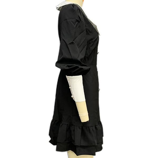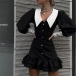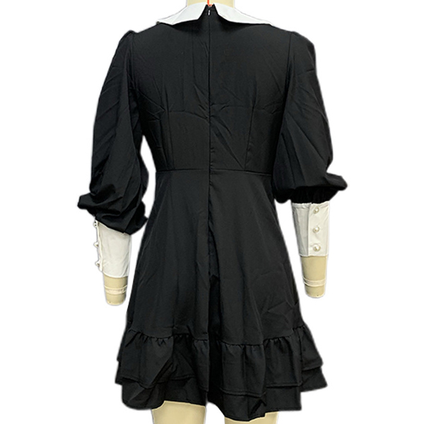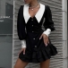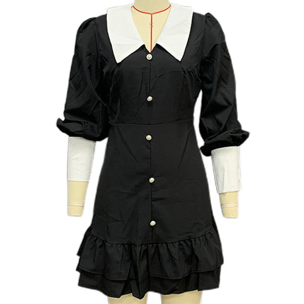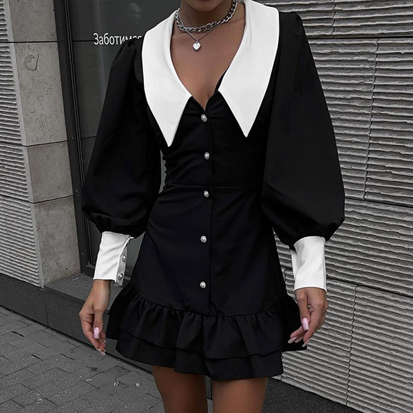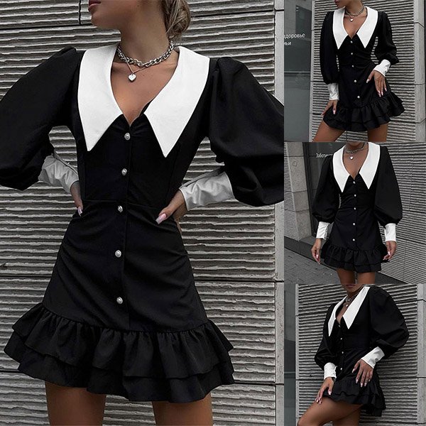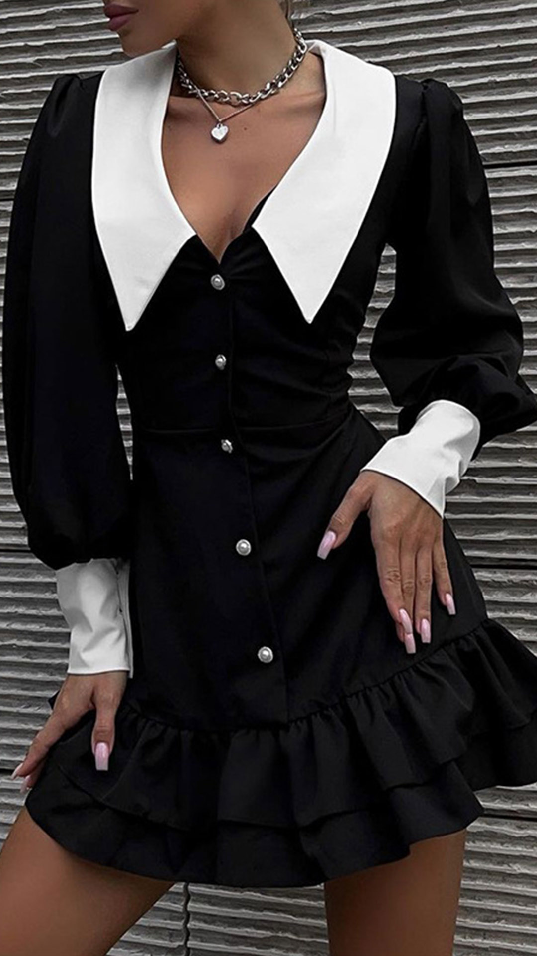 This black dress features a contrast color lapel, V-neckline, long sleeves, front button closure, and ruffle hemline, creating a stylish and chic look. This dress is perfect for creating a fashion-forward and on-trend outfit for various occasions.