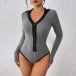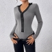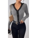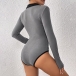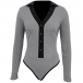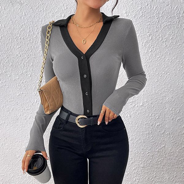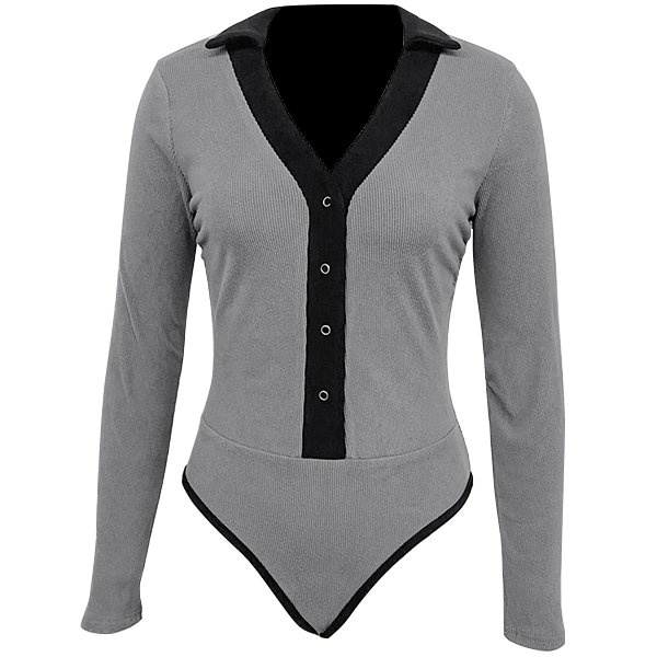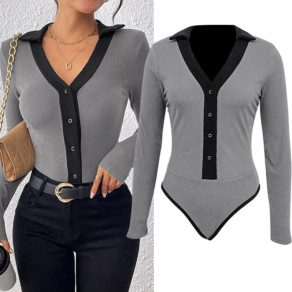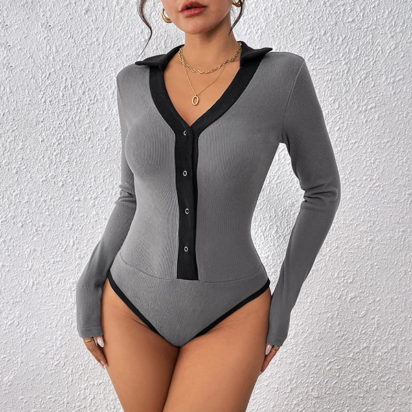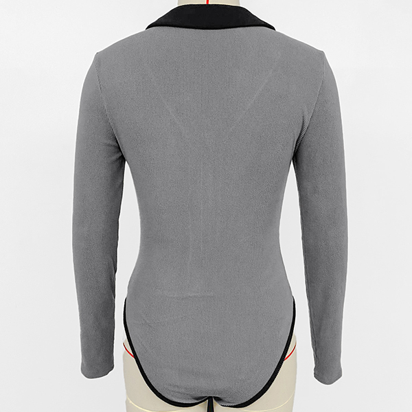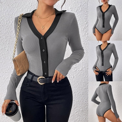 Fashion Contrast Color Lapel V-neck Long Sleeve Ribbed Bodysuit