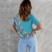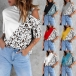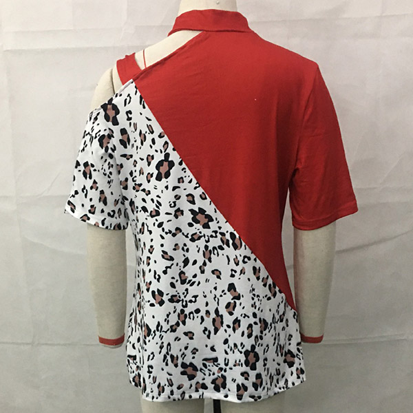 Fashion Contrast Color Leopard Printed Spliced Stand Collar Short Sleeve Open-shuolder Shirt