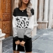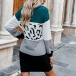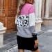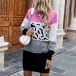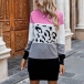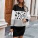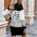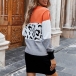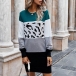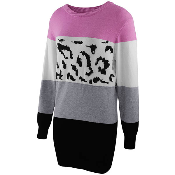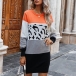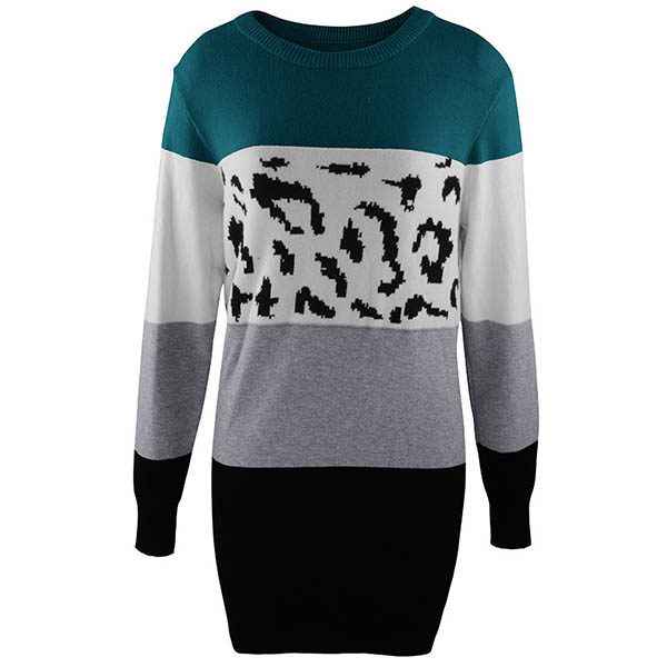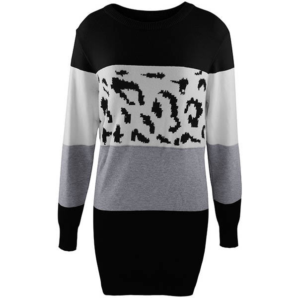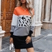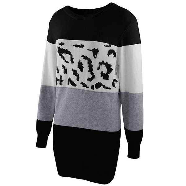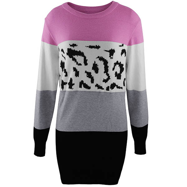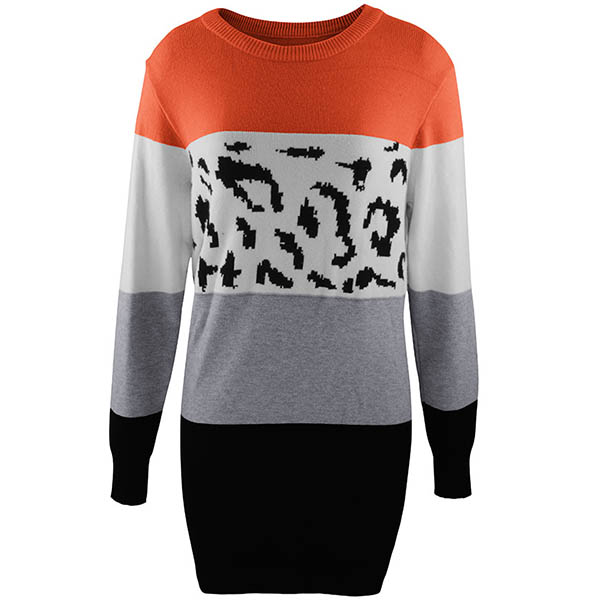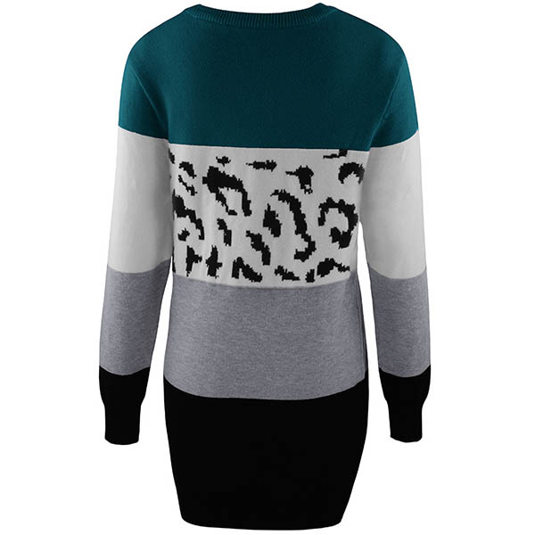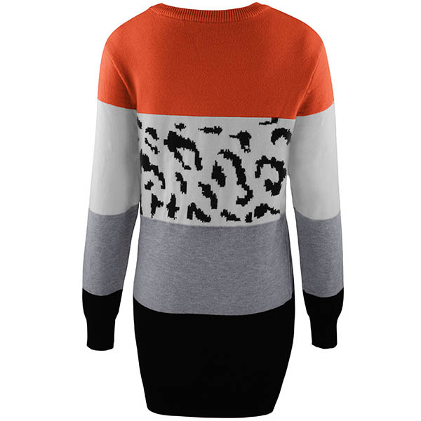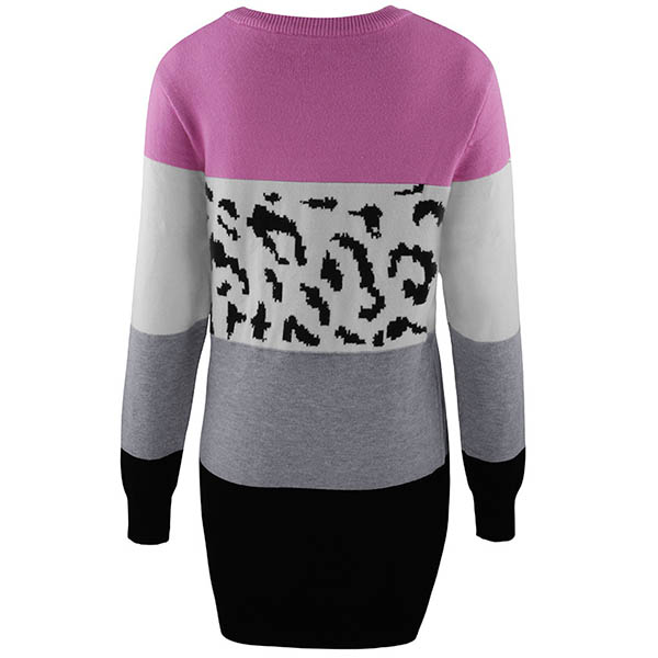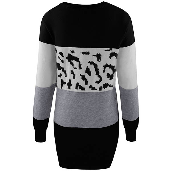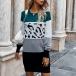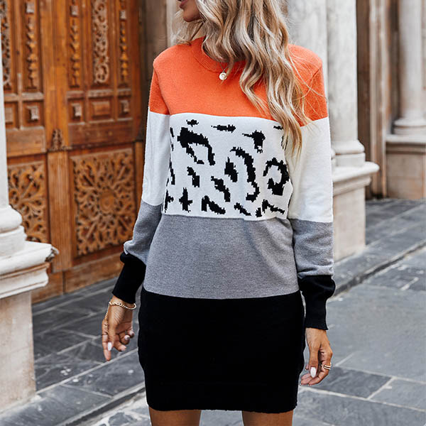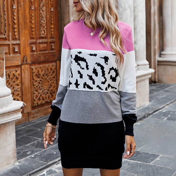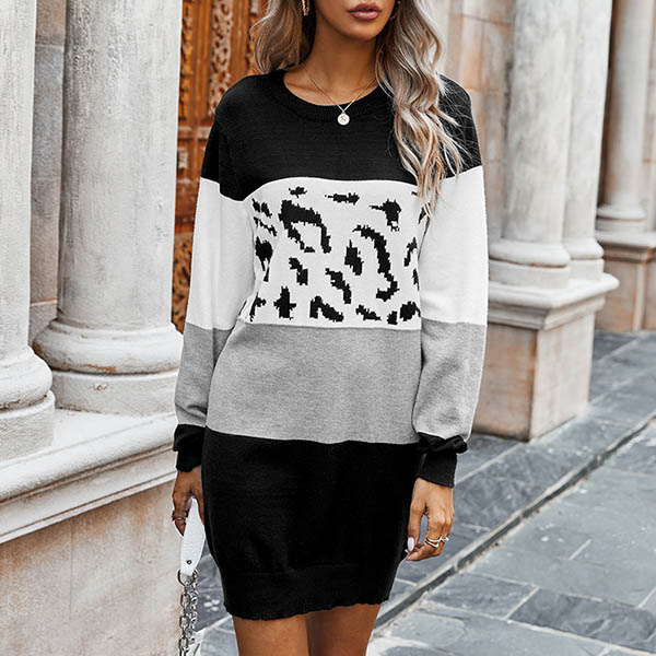 Fashion Contrast Color Leopard Spliced Long Sleeve Round Neck Knit Dress