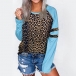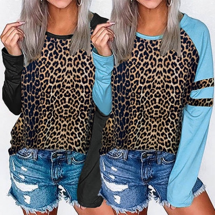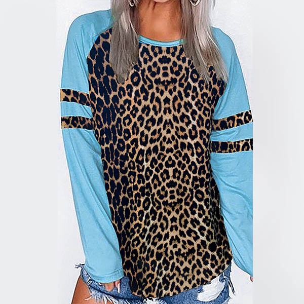 Fashion Contrast Color Leopard Spliced Long Sleeve Round Neck T-shirt