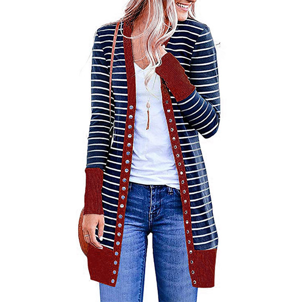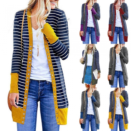 Fashion Contrast Color Long Sleeve Front-button Stripe Cardigan