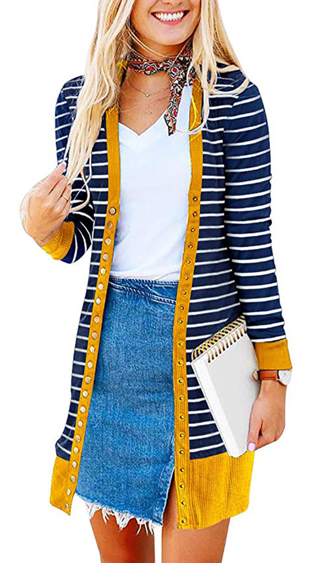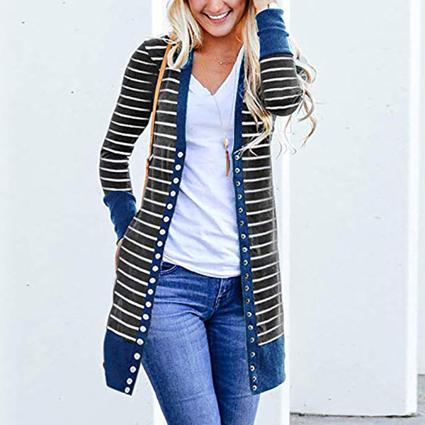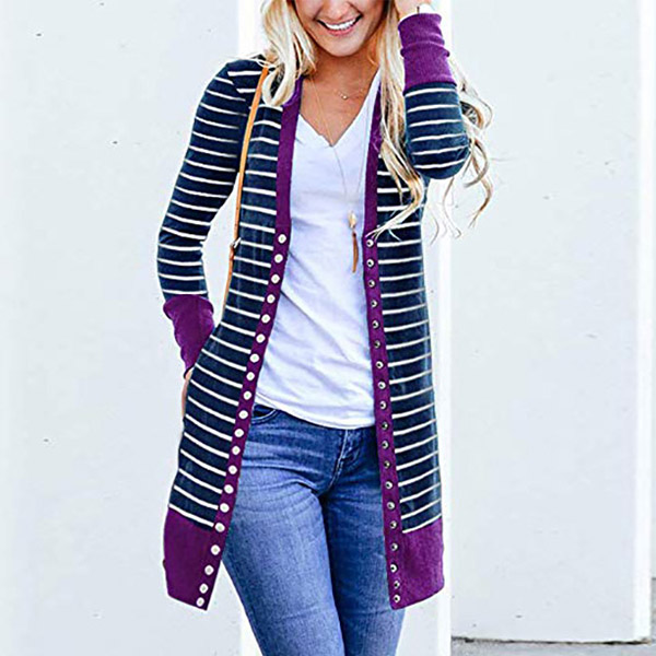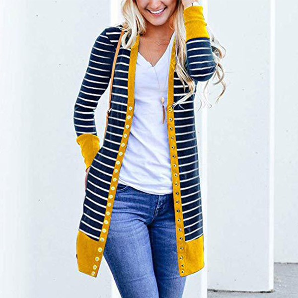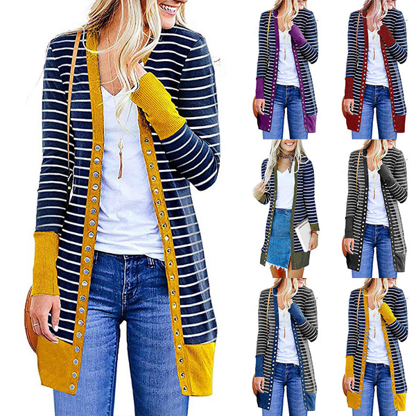 When the days get a little breezy,this cardigan can be a perfect layer to make you feel comfy and warm. The contrast color element at the cuff and hem part will make this piece look more stylish and attractive. Finished with long sleeve and front-button details,this stripe cardigan can give you a perfect transition from summer season to autumn season.