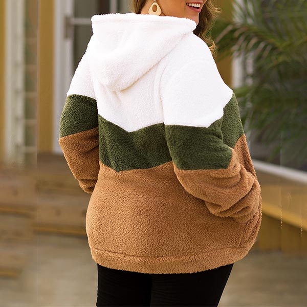 Fashion Contrast Color Long Sleeve Hooded Plush Coat
