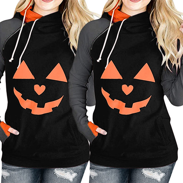 Fashion Contrast Color Long Sleeve Hooded Pumpkin Printed Sweatshirt