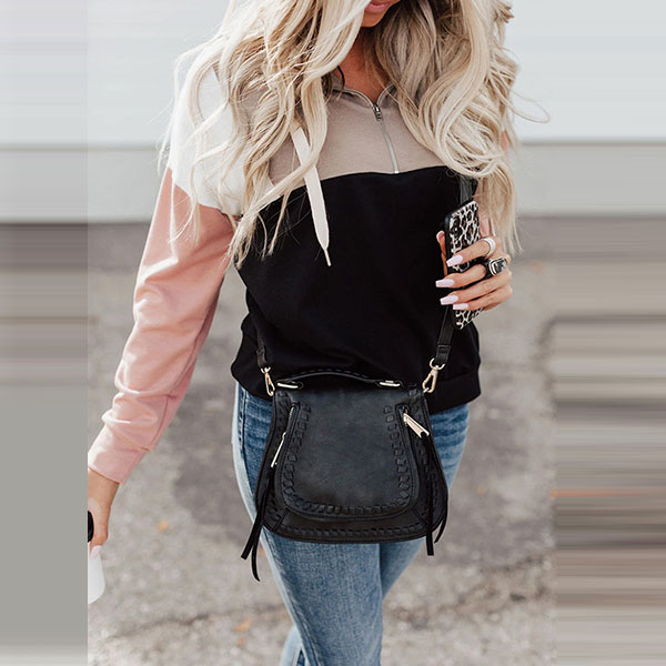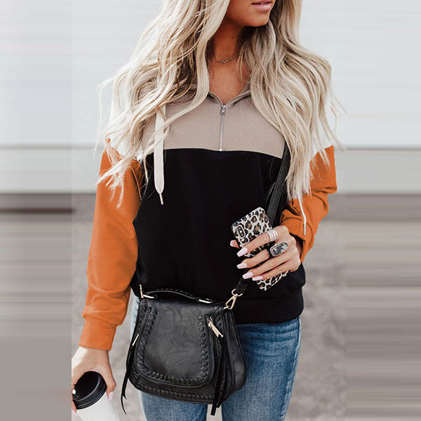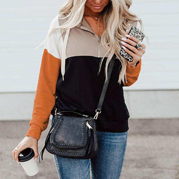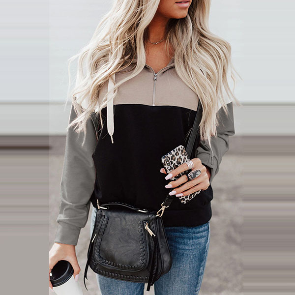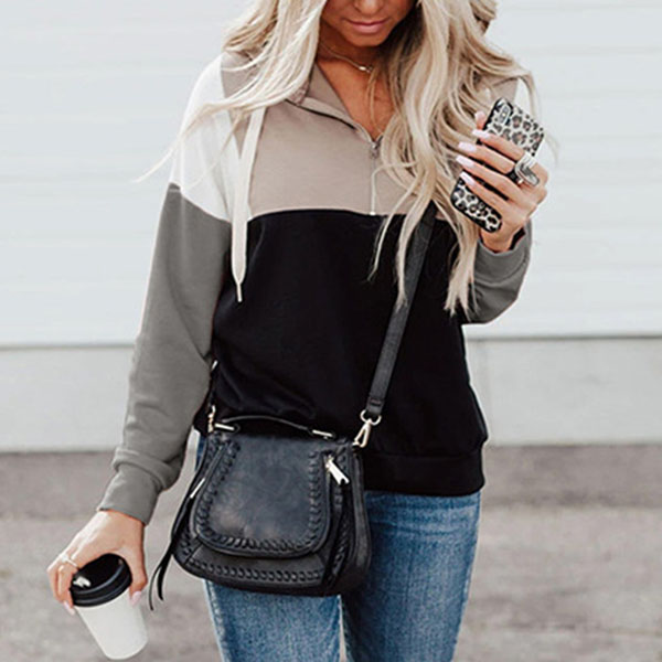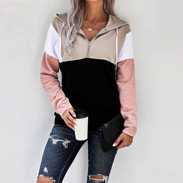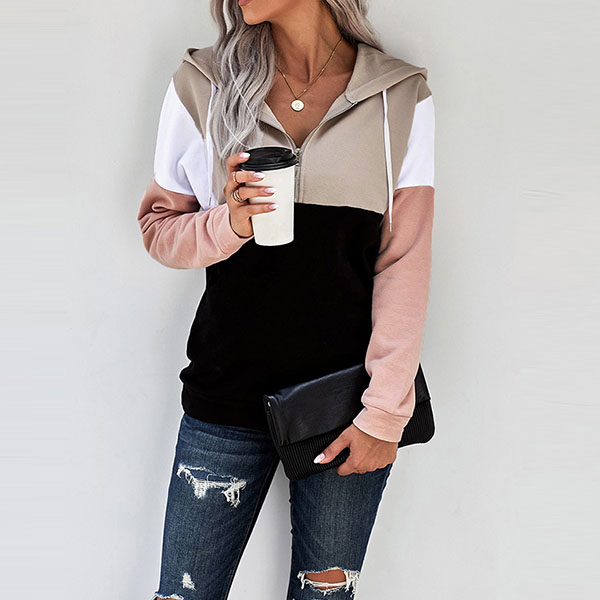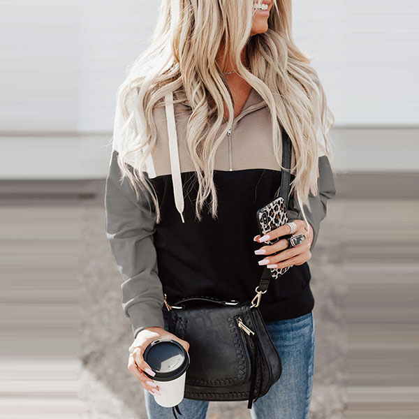 Contrast color sweatshirt is a very popular style this year. It looks very energetic, young and stylish. Finished with long sleeve and hooded silhouette,it is the one you really need in the early autumn. Just invite this piece to your wardrobe to make your wardrobe colorful and complete.