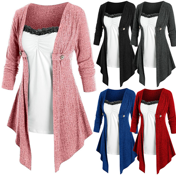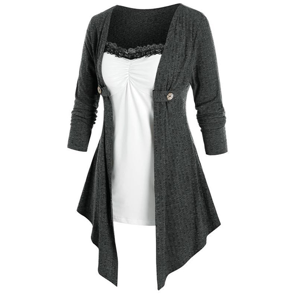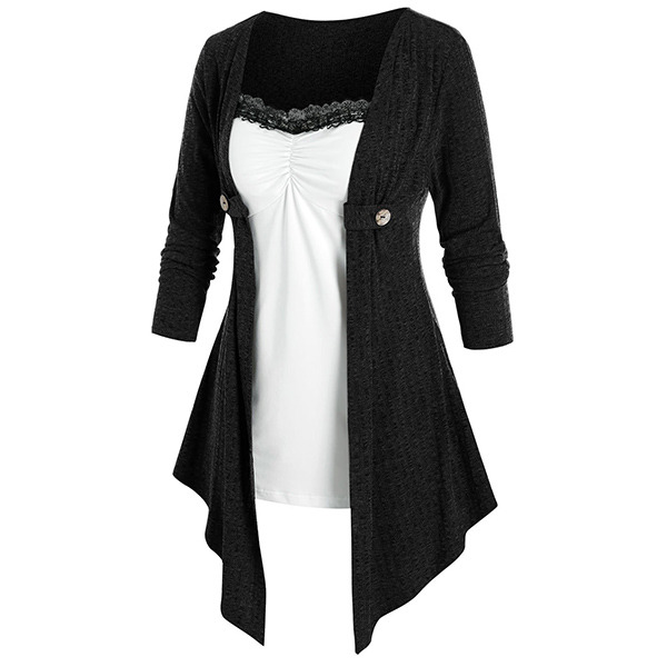 Only need one glance,you would be attracted by this chic and unique top. Mock two-piece design makes this piece look so distinctive,while the contrast color and lace spliced design will further enhance its entire charm. So why not take interest in it?
