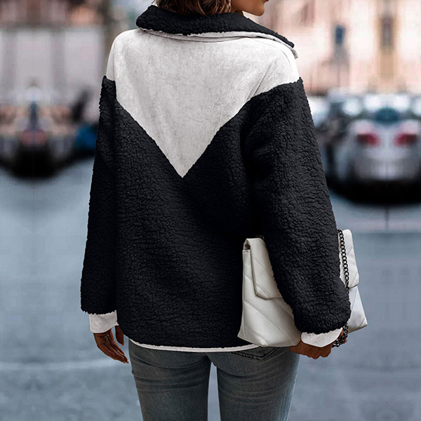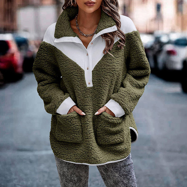 Fashion Contrast Color Long Sleeve Lapel Buttoned Plush Sweatshirt
