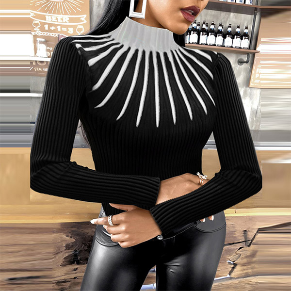 Fashion Contrast Color Long Sleeve Mock Neck Slim Fit Knit Top