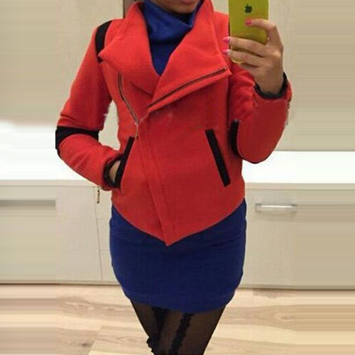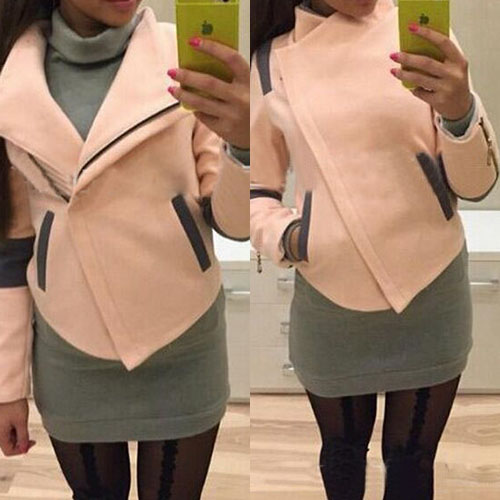 Fashion Contrast Color Long Sleeve Oblique Zipper Woolen Coat