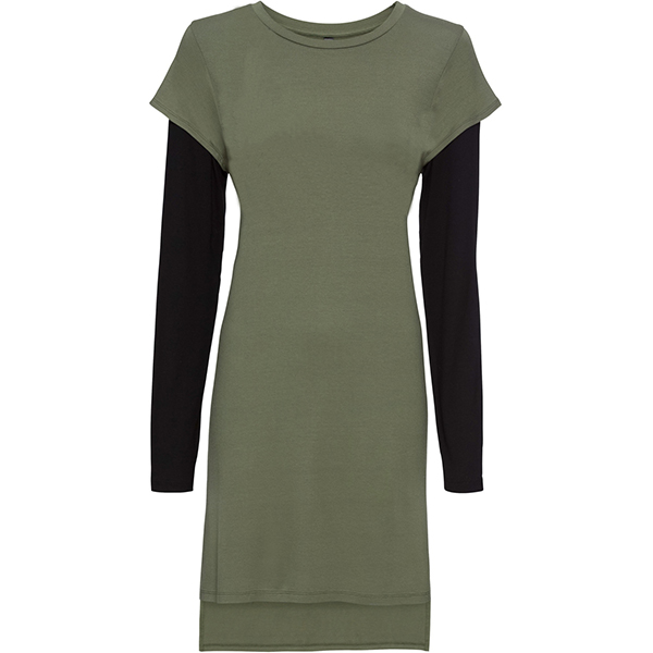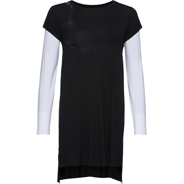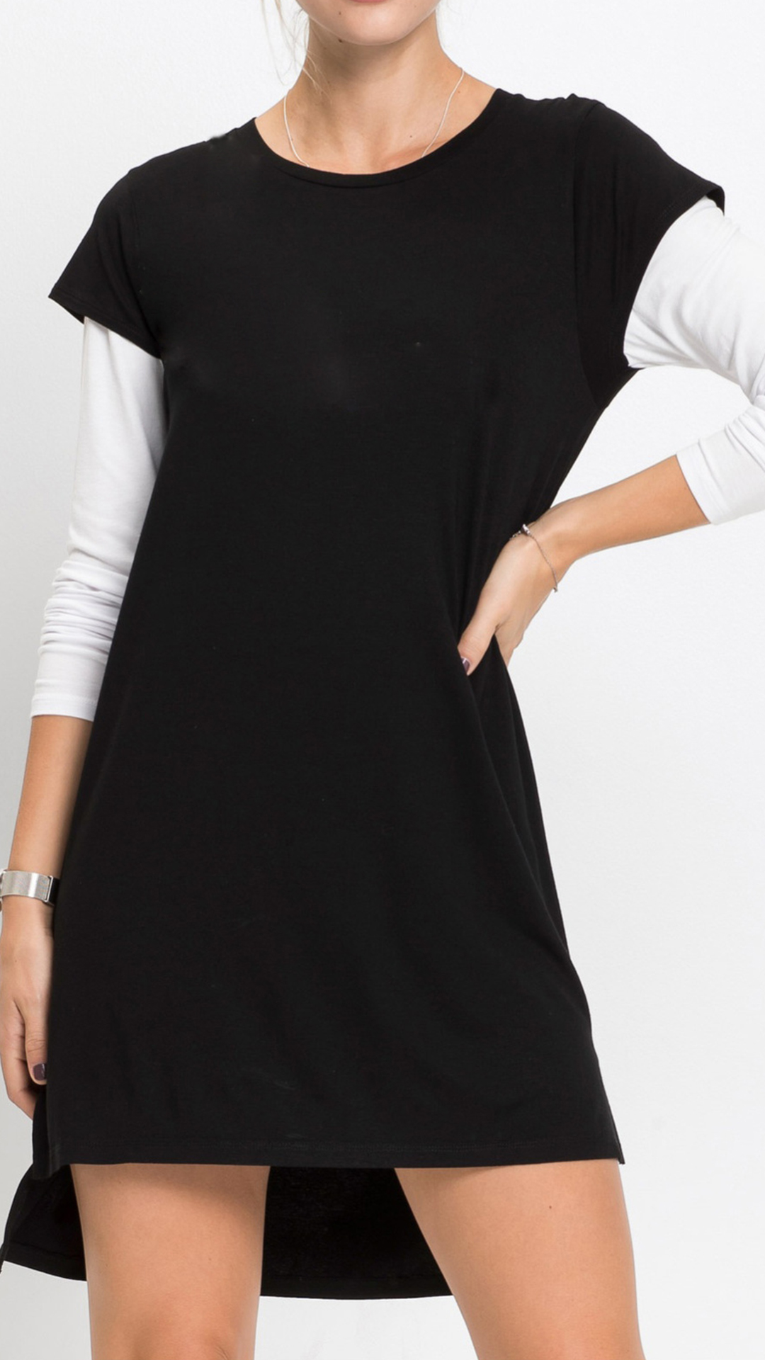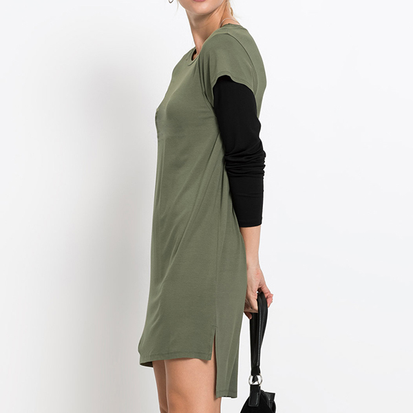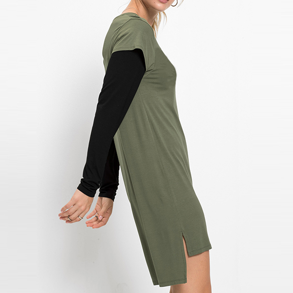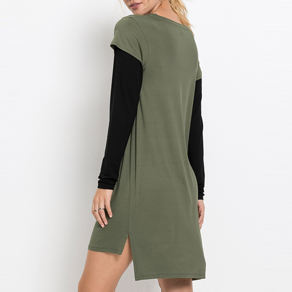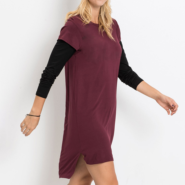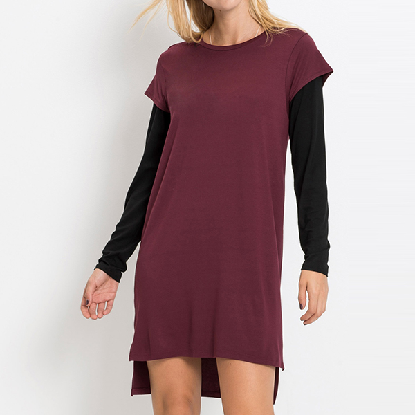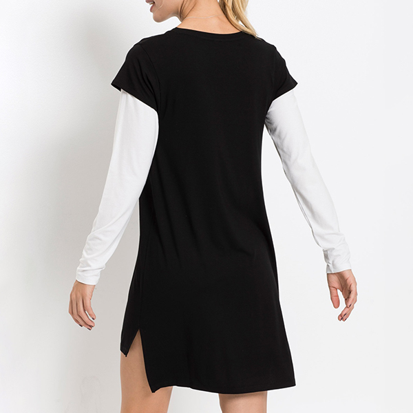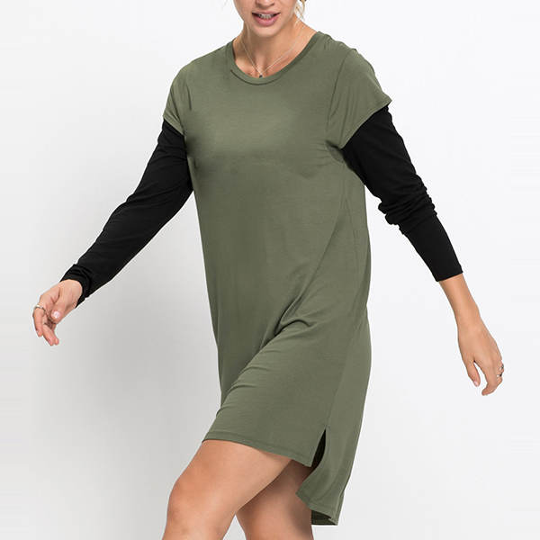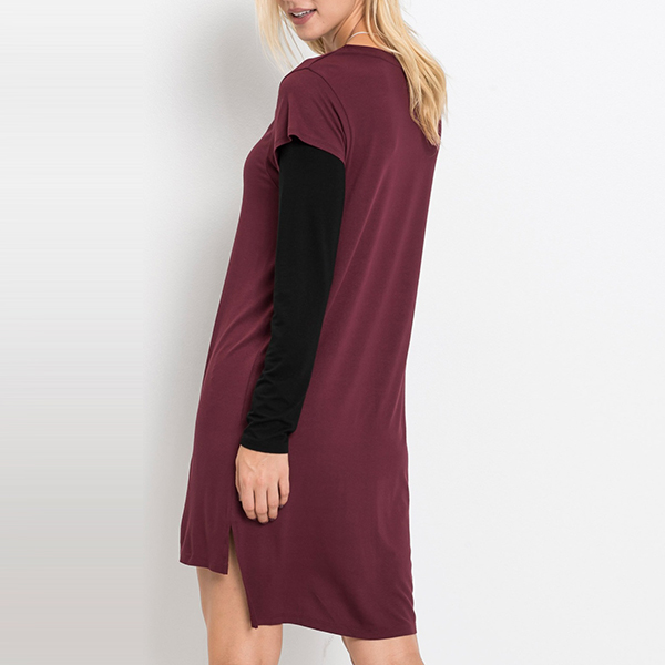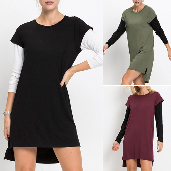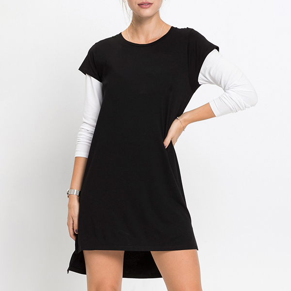 When it comes to a laid-back but fashionable daily look,you can just have a try this mock two-piece t-shirt dress. Contrast color element and high-low hem design make this piece look so distinctive and attractive. Crafted from soft and breathable fabric,with long sleeve and round neck design,this t-shirt also can ensure you an all-day comfort. So why not have a try this piece?