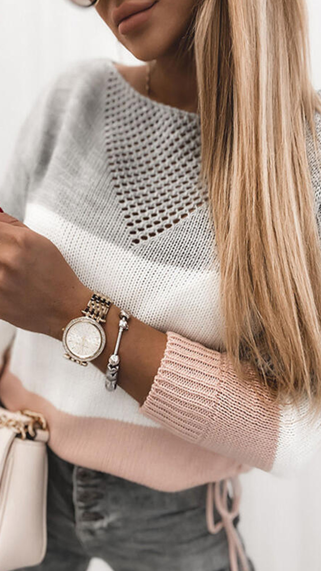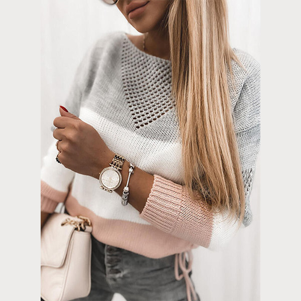 Fashion Contrast Color Long Sleeve Round Neck Hollow Out Knit Sweater