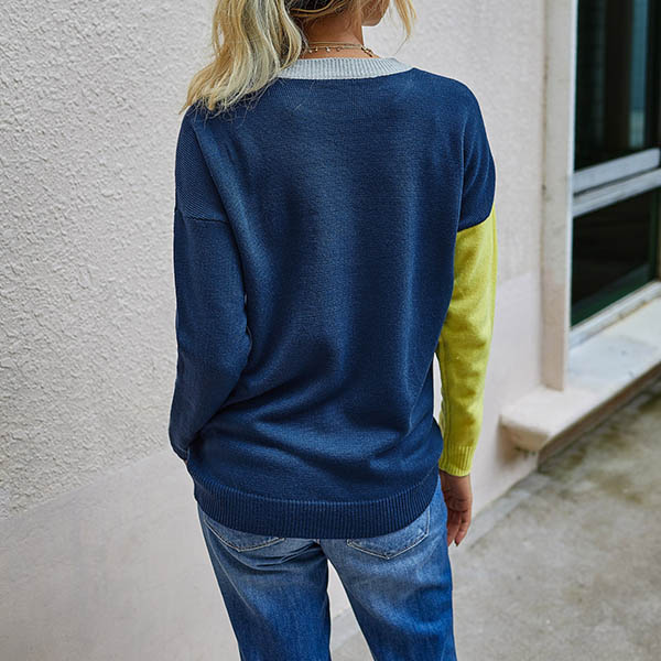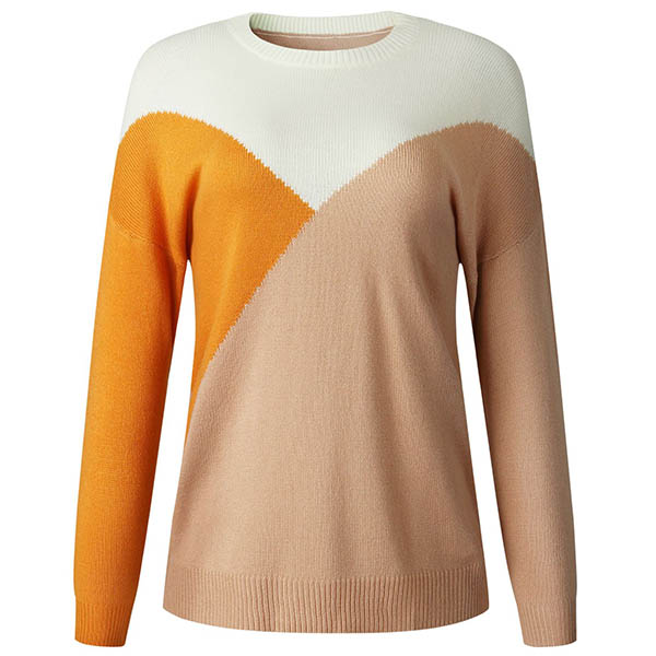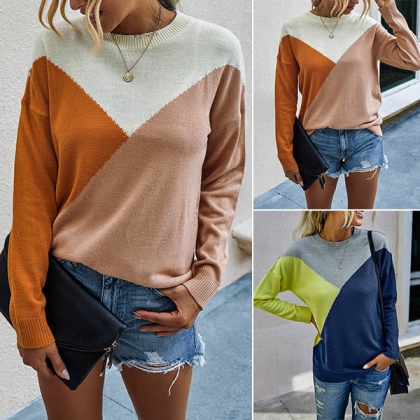 Fashion Contrast Color Long Sleeve Round Neck Knit Top