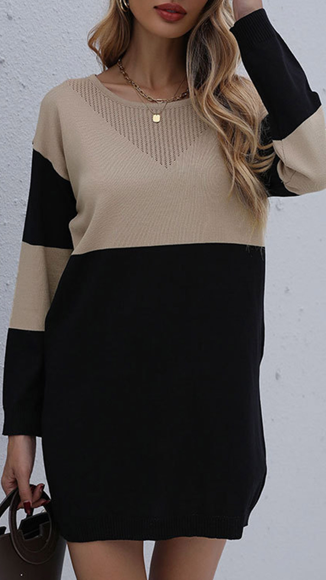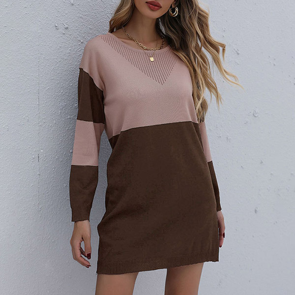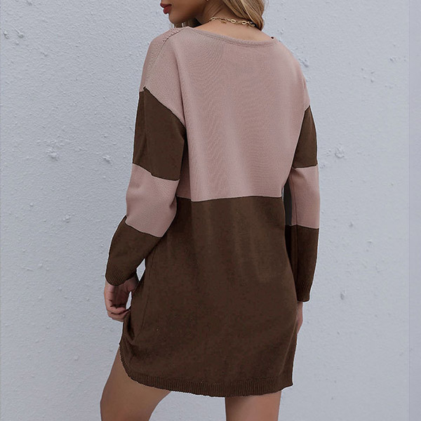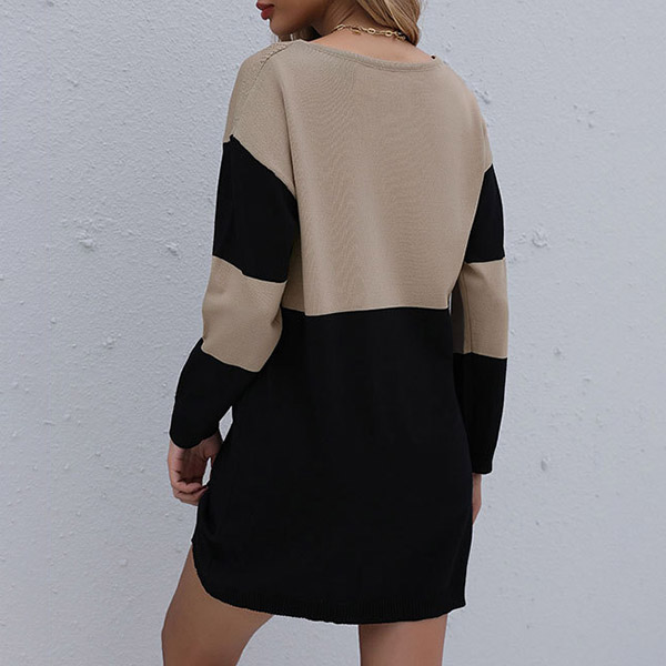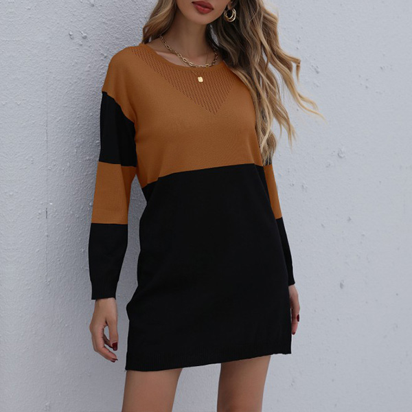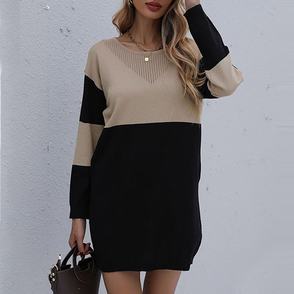 Fashion Contrast Color Long Sleeve Round Neck Loose Knit Dress