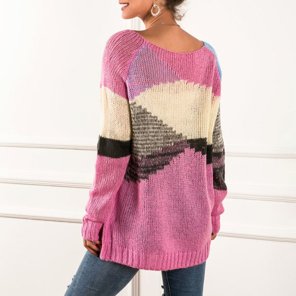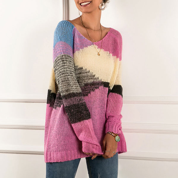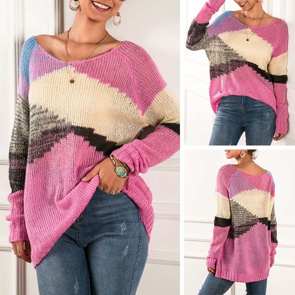 Fashion Contrast Color Long Sleeve Round Neck Loose Knit Top
