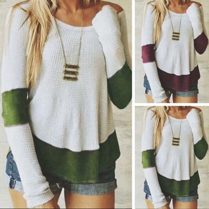Fashion Contrast Color Long Sleeve Round Neck Loose T-shirt