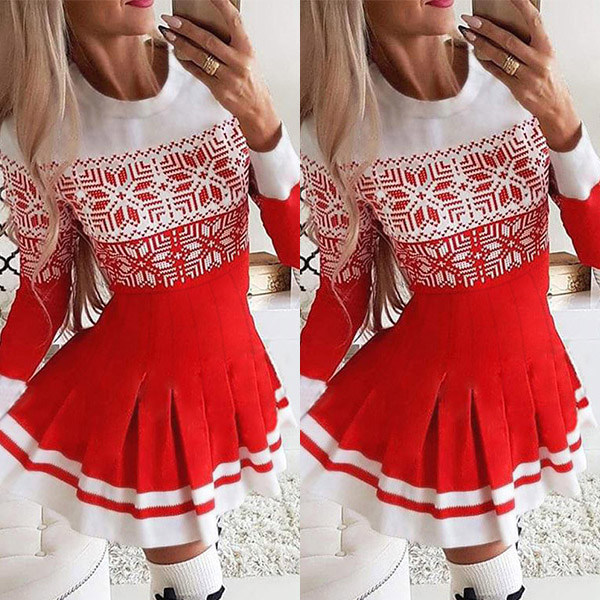 To greet the arrival of the Christmas Day,you can invite this dress to your wardrobe. The red tone and chic printed pattern design will add some festival atmosphere. Finished with long sleeve,round neck and high waist design,this dress can ensure you a happy and memorable Christmas time.