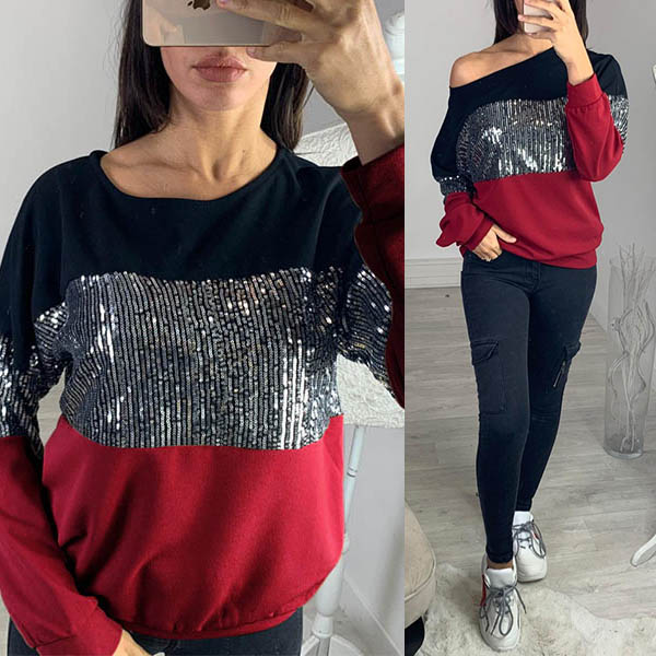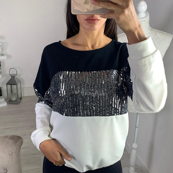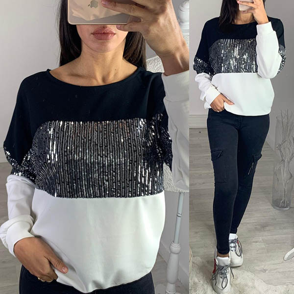 For a simple,casual and stylish autumn look,you can have a try this sweatshirt. Contrast color style,finished with long sleeve and round neck design,the sequin spliced details will make this piece look more shinning and attractive. Simply matching with a jeans can offer you a fashionable look.
