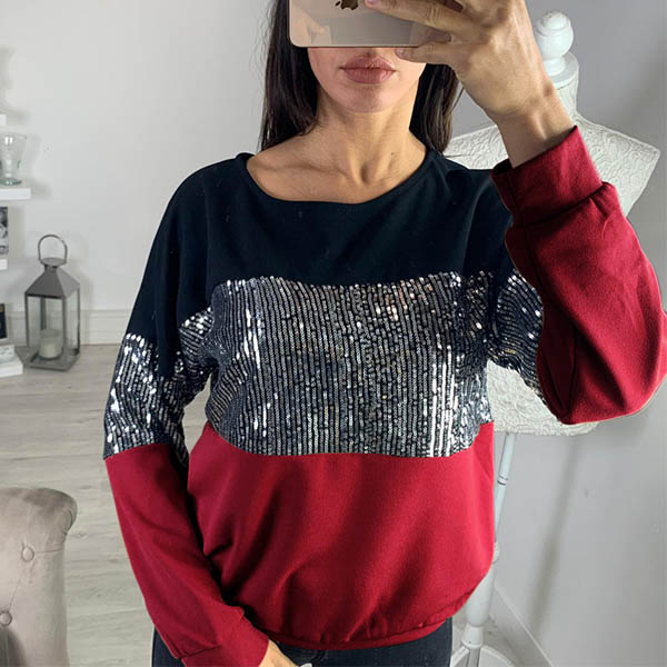 Fashion Contrast Color Long Sleeve Round Neck Sequin Spliced Sweatshirt