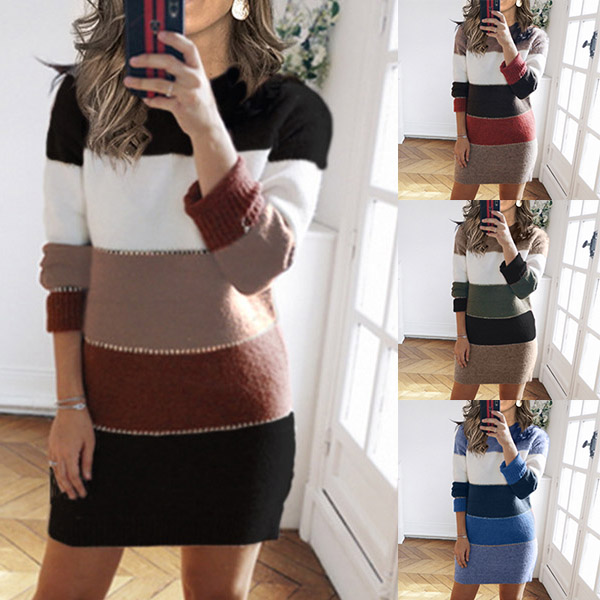 Give your wardrobe a seasonal update by adding this sweater dress. Contrast color design makes it look so stylish and attractive. Finished with long sleeve,round neck and a fit silhouette,this sweater dress not only can keep you warm,but also can showcase your slender figure. It is worth to arouse your attention in these cold days.