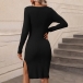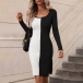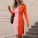 Fashion Contrast Color Long Sleeve Round Neck Slit Bodycon Dress