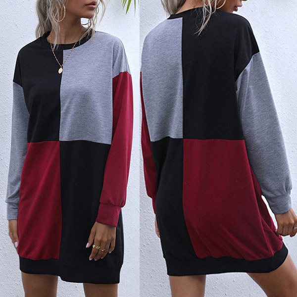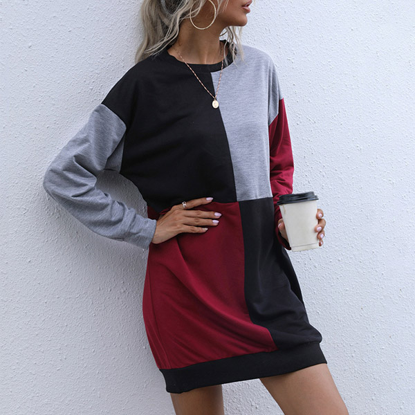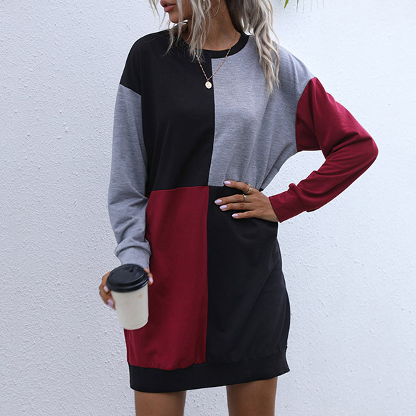 Fashion Contrast Color Long Sleeve Round Neck Sweatshirt Dress