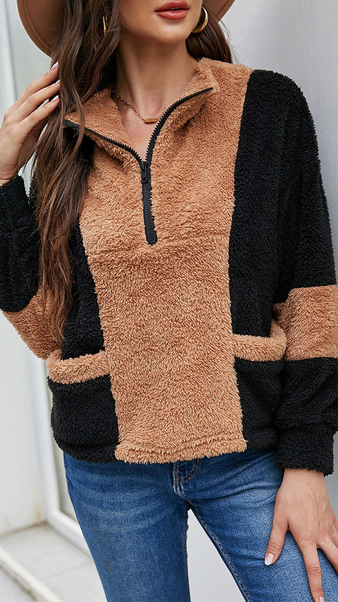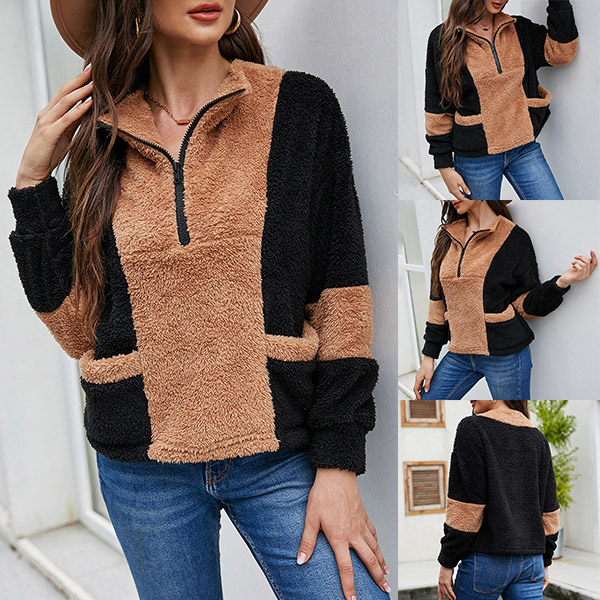 Feels cold? Then you can just slip into this plush sweatshirt. Its soft,cozy plush fabric and stand collar design can give you a warm and comfortable day. Contrast color style,finished with long sleeve and front-pocket design,this sweatshirt that combines of cozy and stylish vibes is worth to arouse your attention.