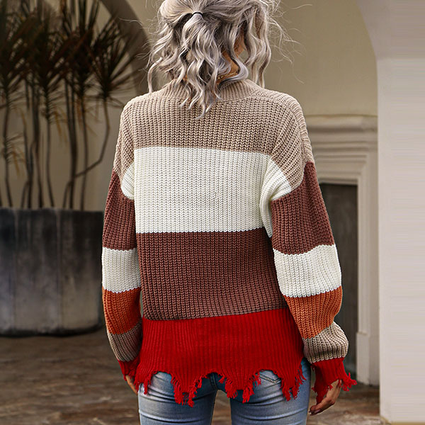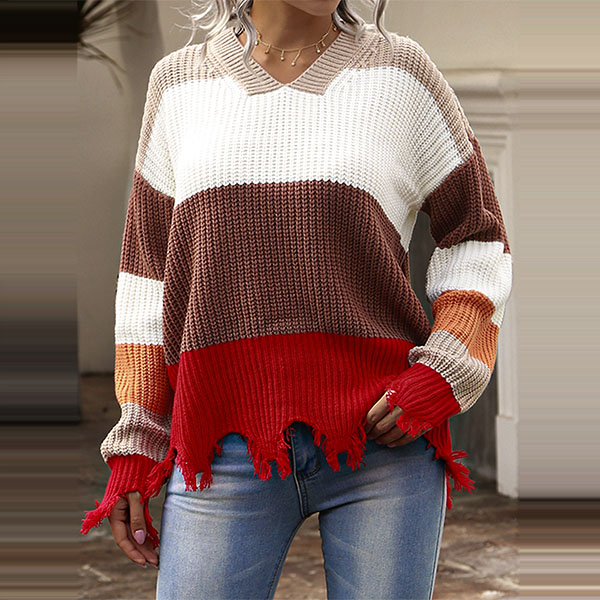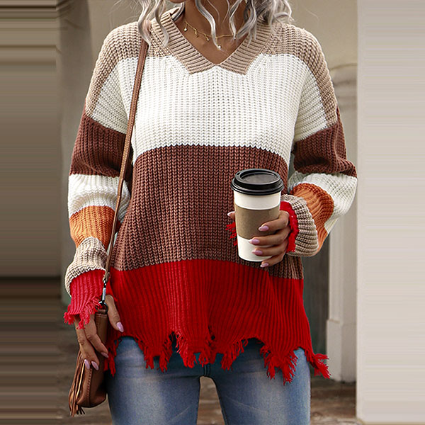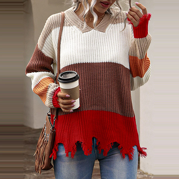 Fashion Contrast Color Long Sleeve V-neck Frayed Hem Sweater