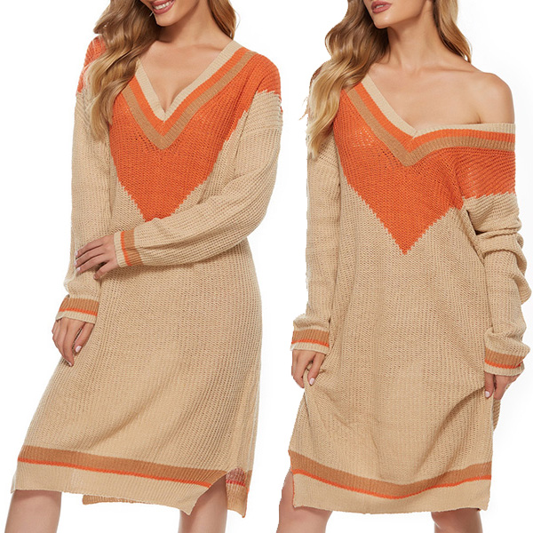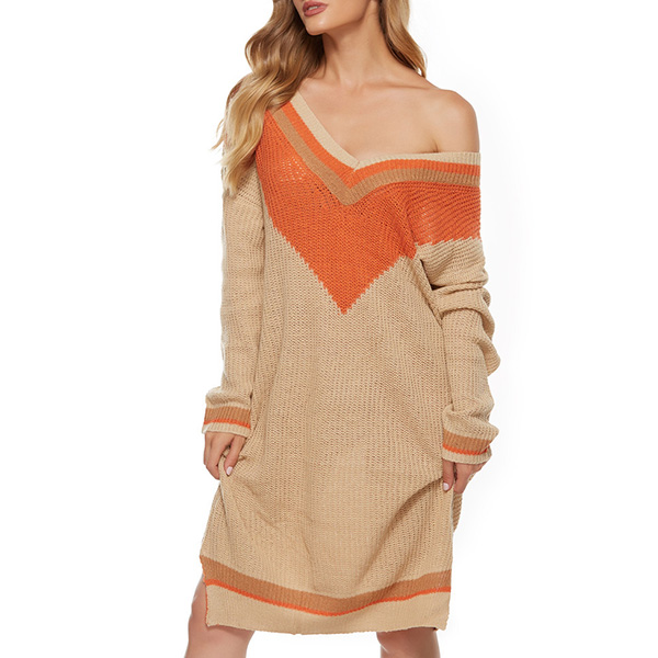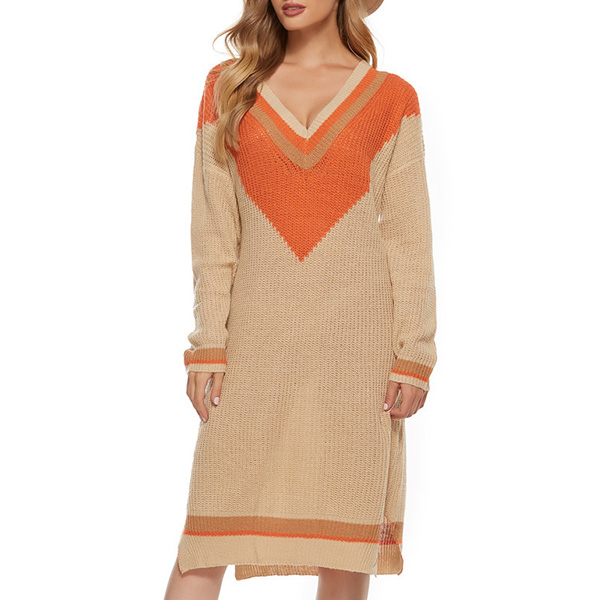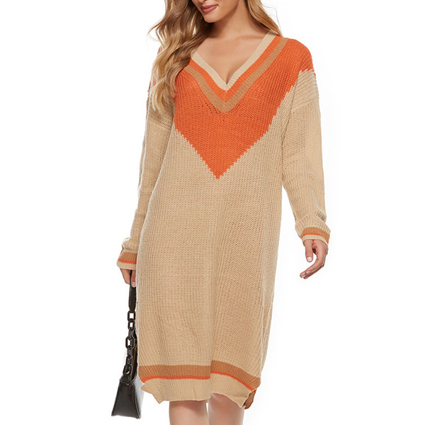 Fashion Contrast Color Long Sleeve V-neck Knit Dress