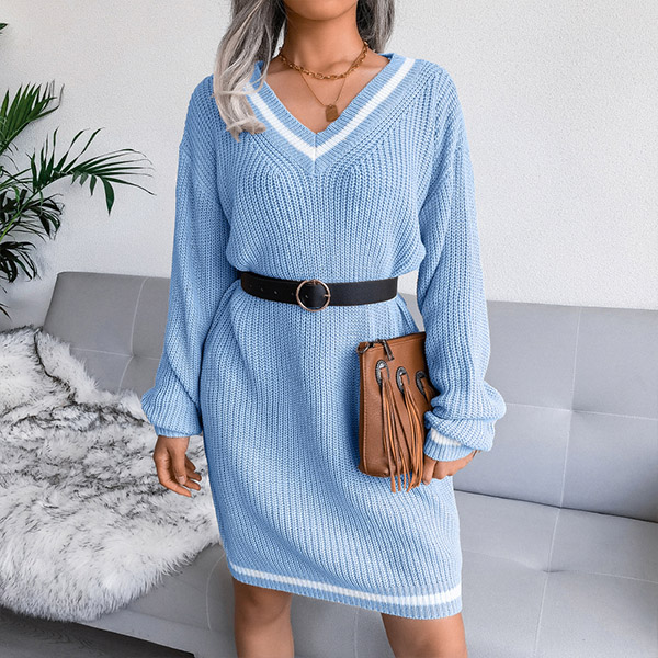 Fashion Contrast Color Long Sleeve V-neck Knit Sweater Dress