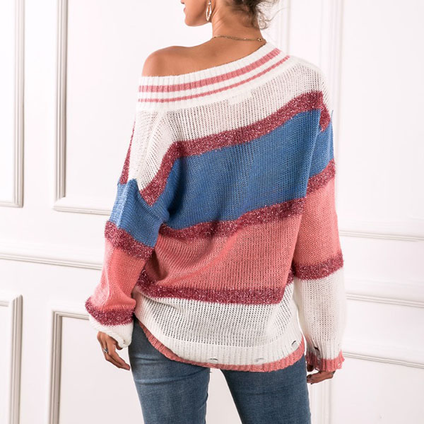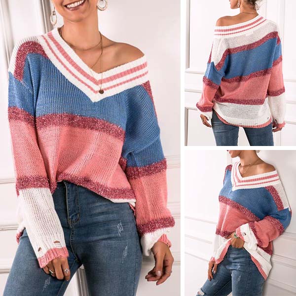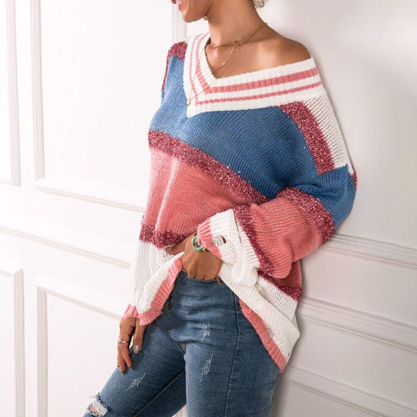 It is wise for you to slip into this knit top to greet these autumn days. Contrast color design makes it look not so simple and dull,while the v-neck design can lend you a dash of feminine vibes. Finished with long sleeve and a loose silhouette design,this piece knows how to keep you warm yet stylish.