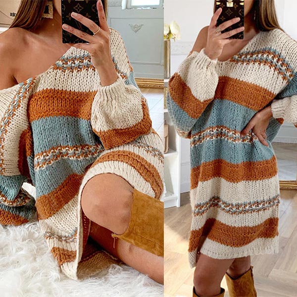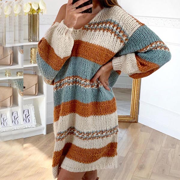 Fashion Contrast Color Long Sleeve V-neck Loose Sweater Dress