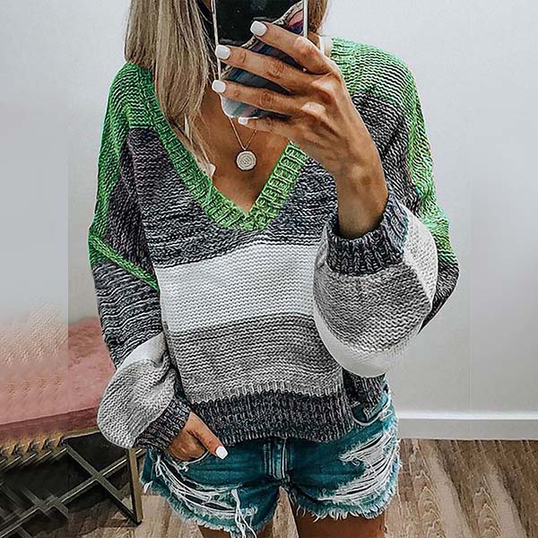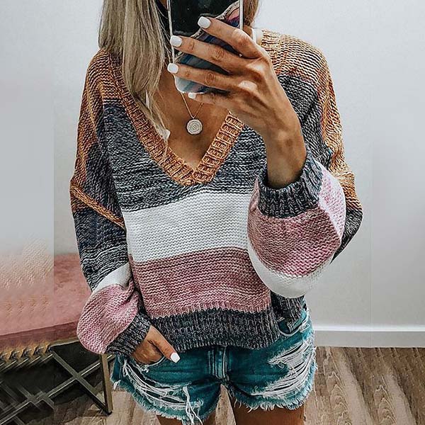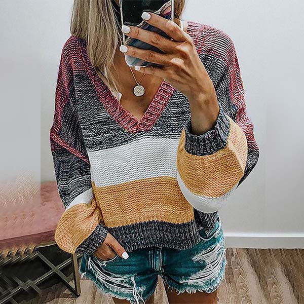 Fashion Contrast Color Long Sleeve V-neck Sweater